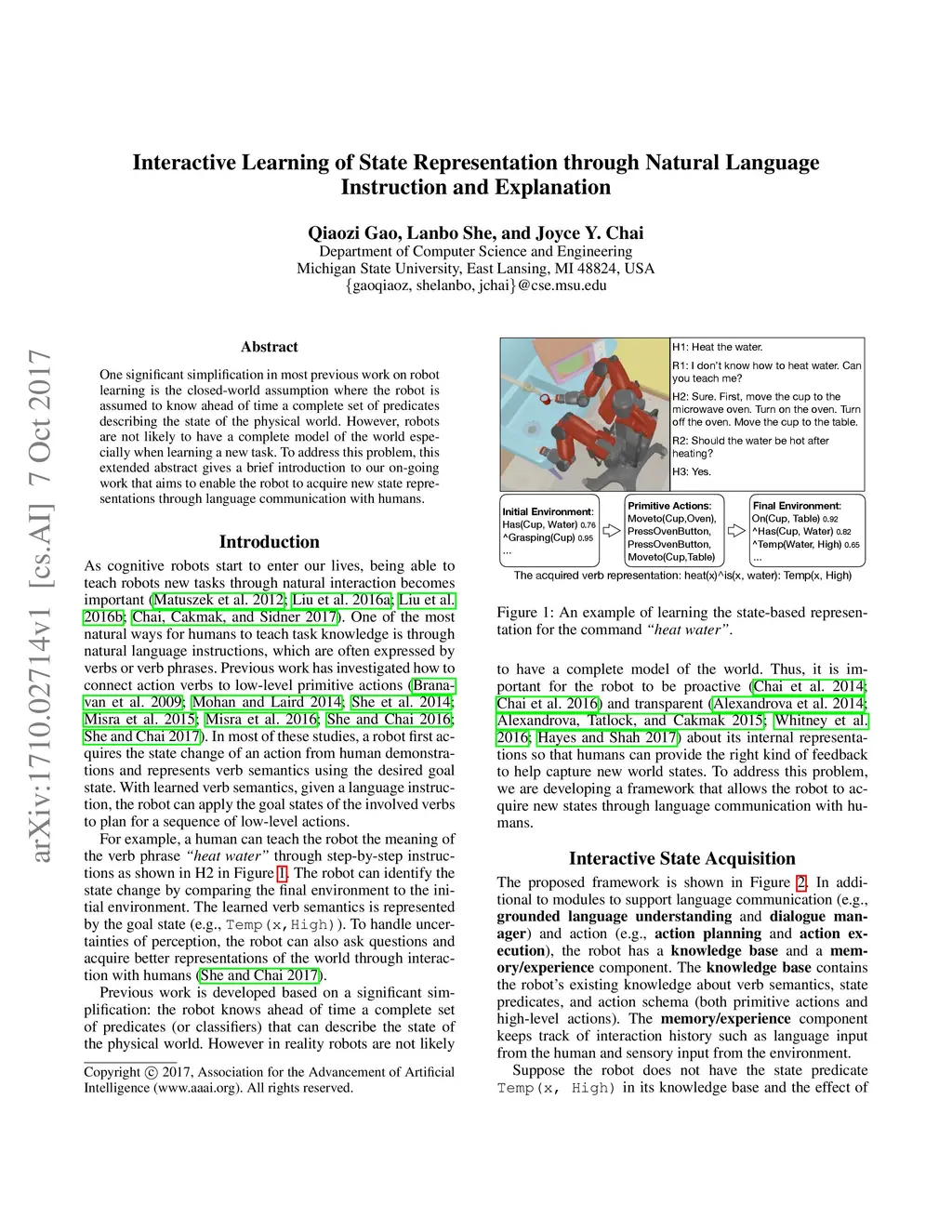One significant simplification in most previous work on robot learning is the closed-world assumption where the robot is assumed to know ahead of time a complete set of predicates describing the state of the physical world. However, robots are not likely to have a complete model of the world especially when learning a new task. To address this problem, this extended abstract gives a brief introduction to our on-going work that aims to enable the robot to acquire new state representations through language communication with humans.
