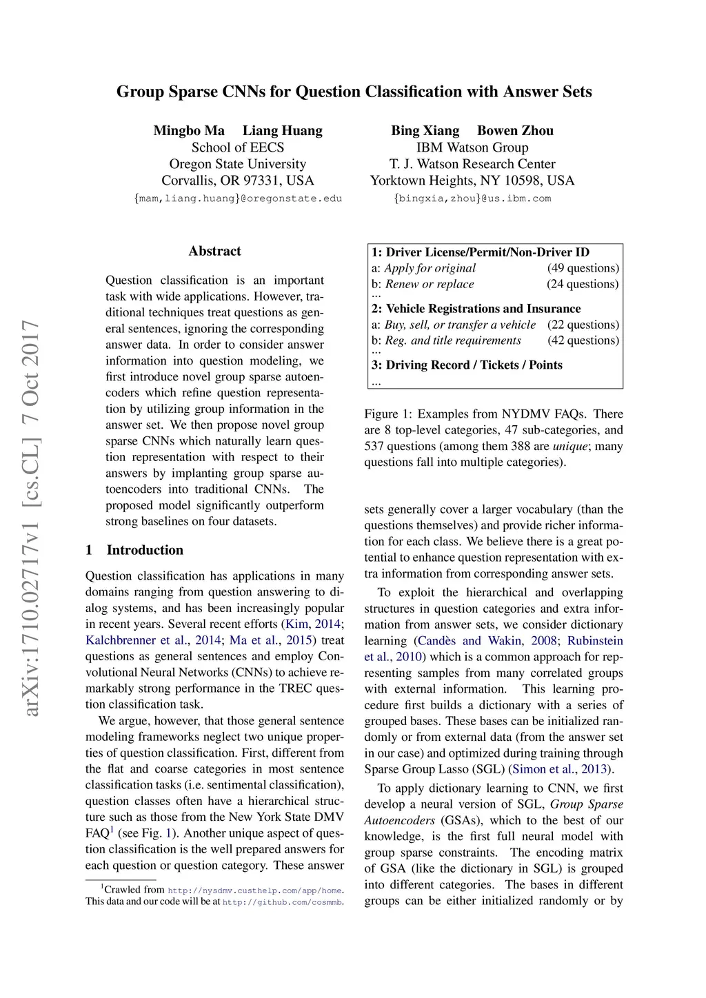 Group Sparse CNNs for Question Classification with Answer Sets