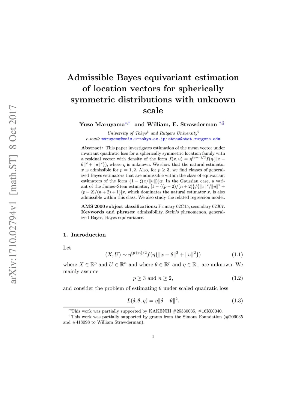 This paper investigates estimation of the mean vector under invariant quadratic loss for a spherically symmetric location family with a residual vector with density of the form $ f(x,u)=\eta^{(p+n)/2}f(\eta\{\|x-\theta\|^2+\|u\|^2\}) $, where is unknown. We show that the natural estimator is admissible for . Also, for , we find classes of generalized Bayes estimators that are admissible within the class of equivariant estimators of the form . In the Gaussian case, a variant of the James--Stein estimator, , which dominates the natural estimator , is also admissible within this class. We also study the related regression model.