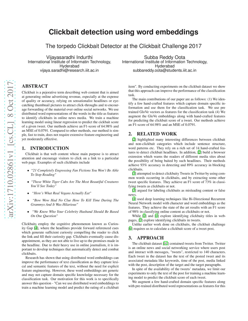 Clickbait is a pejorative term describing web content that is aimed at generating online advertising revenue, especially at the expense of quality or accuracy, relying on sensationalist headlines or eye-catching thumbnail pictures to attract click-throughs and to encourage forwarding of the material over online social networks. We use distributed word representations of the words in the title as features to identify clickbaits in online news media. We train a machine learning model using linear regression to predict the cickbait score of a given tweet. Our methods achieve an F1-score of 64.98\% and an MSE of 0.0791. Compared to other methods, our method is simple, fast to train, does not require extensive feature engineering and yet moderately effective.