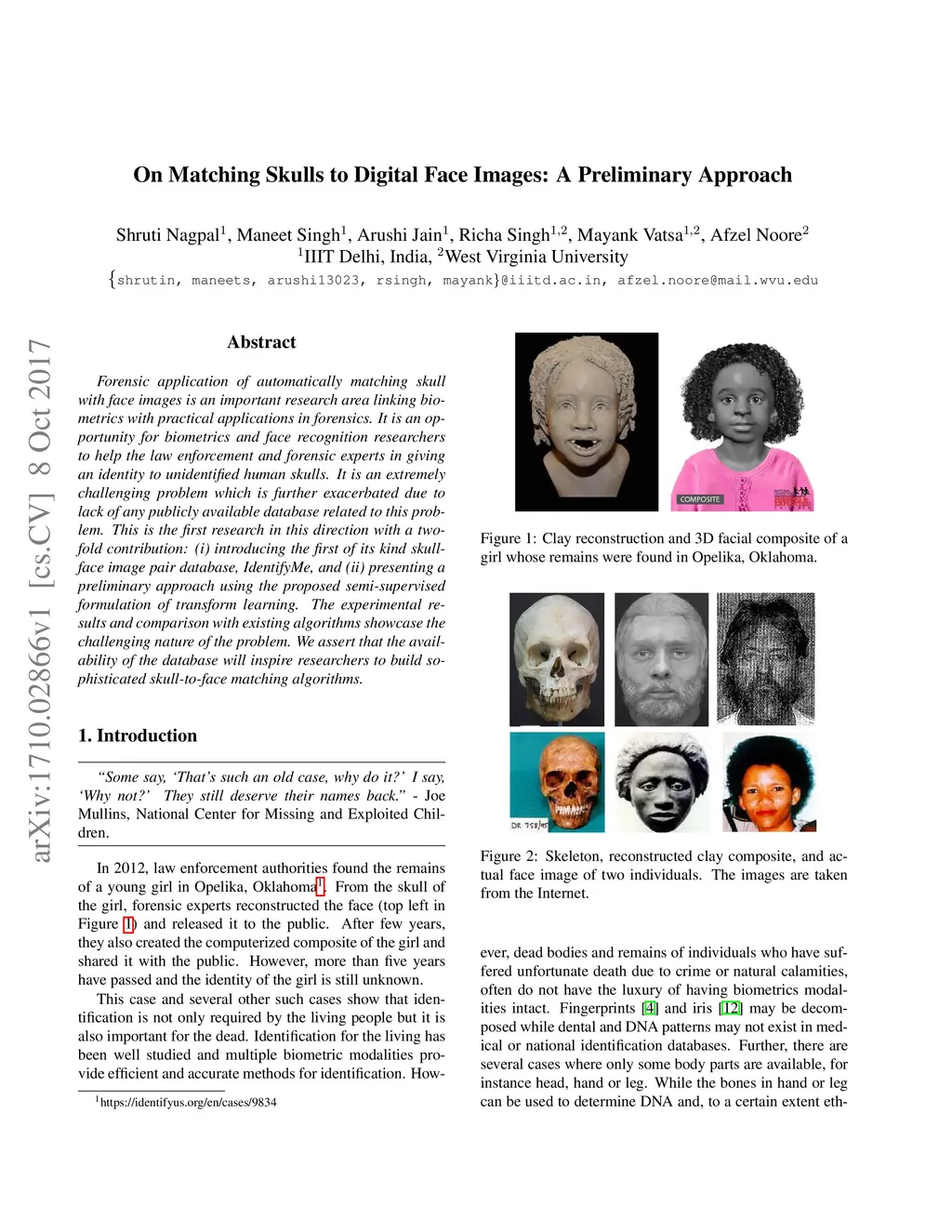 Forensic application of automatically matching skull with face images is an important research area linking biometrics with practical applications in forensics. It is an opportunity for biometrics and face recognition researchers to help the law enforcement and forensic experts in giving an identity to unidentified human skulls. It is an extremely challenging problem which is further exacerbated due to lack of any publicly available database related to this problem. This is the first research in this direction with a two-fold contribution: (i) introducing the first of its kind skull-face image pair database, IdentifyMe, and (ii) presenting a preliminary approach using the proposed semi-supervised formulation of transform learning. The experimental results and comparison with existing algorithms showcase the challenging nature of the problem. We assert that the availability of the database will inspire researchers to build sophisticated skull-to-face matching algorithms.