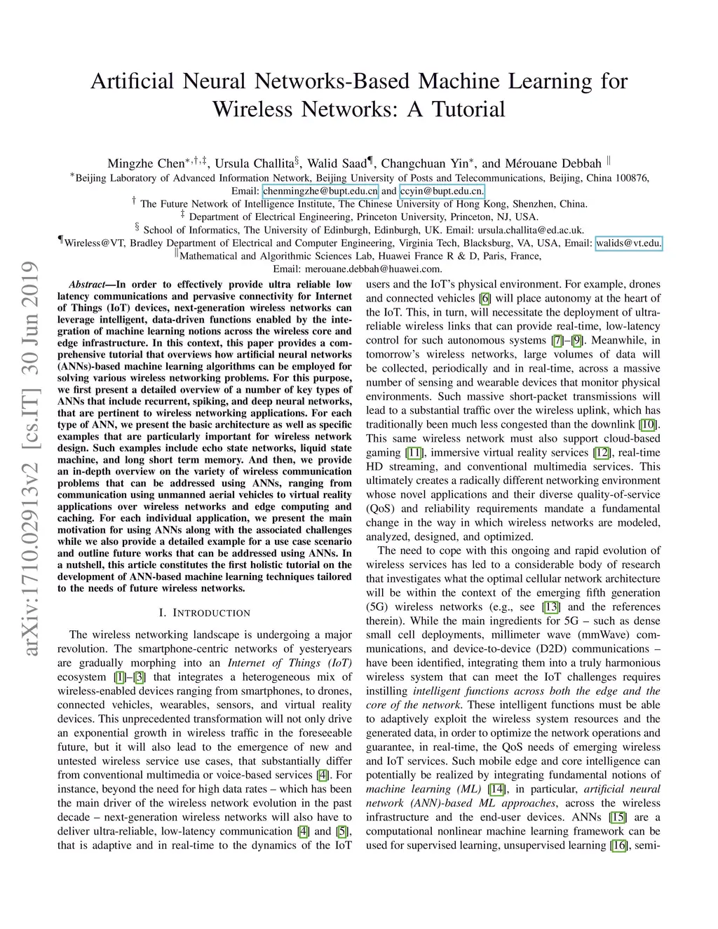 Next-generation wireless networks must support ultra-reliable, low-latency communication and intelligently manage a massive number of Internet of Things (IoT) devices in real-time, within a highly dynamic environment. This need for stringent communication quality-of-service (QoS) requirements as well as mobile edge and core intelligence can only be realized by integrating fundamental notions of artificial intelligence (AI) and machine learning across the wireless infrastructure and end-user devices. In this context, this paper provides a comprehensive tutorial that introduces the main concepts of machine learning, in general, and artificial neural networks (ANNs), in particular, and their potential applications in wireless communications. For this purpose, we present a comprehensive overview on a number of key types of neural networks that include feed-forward, recurrent, spiking, and deep neural networks. For each type of neural network, we present the basic architecture and training procedure, as well as the associated challenges and opportunities. Then, we provide an in-depth overview on the variety of wireless communication problems that can be addressed using ANNs, ranging from communication using unmanned aerial vehicles to virtual reality and edge caching.For each individual application, we present the main motivation for using ANNs along with the associated challenges while also providing a detailed example for a use case scenario and outlining future works that can be addressed using ANNs. In a nutshell, this article constitutes one of the first holistic tutorials on the development of machine learning techniques tailored to the needs of future wireless networks.
