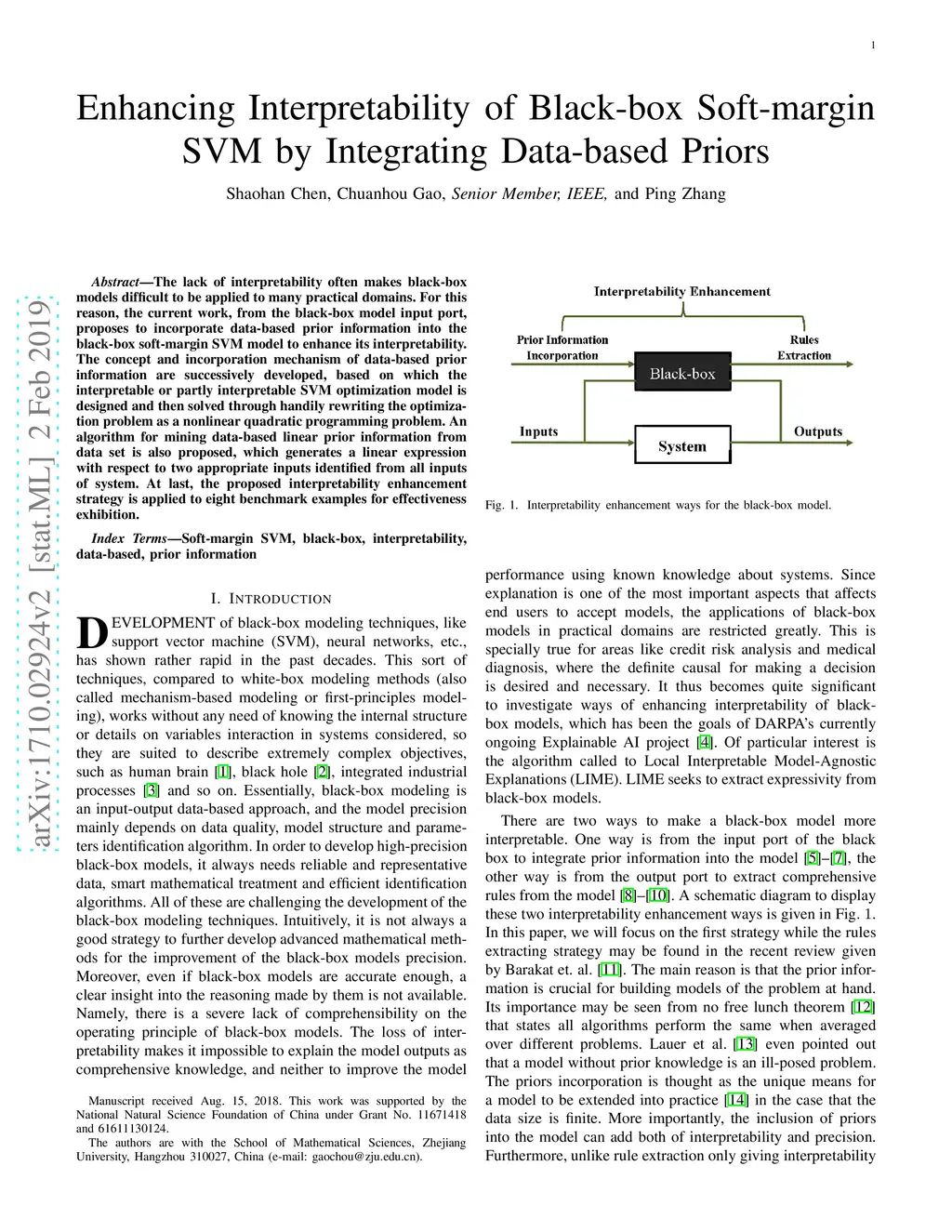The lack of interpretability often makes black-box models difficult to be applied to many practical domains. For this reason, the current work, from the black-box model input port, proposes to incorporate data-based prior information into the black-box soft-margin SVM model to enhance its interpretability. The concept and incorporation mechanism of data-based prior information are successively developed, based on which the interpretable or partly interpretable SVM optimization model is designed and then solved through handily rewriting the optimization problem as a nonlinear quadratic programming problem. An algorithm for mining data-based linear prior information from data set is also proposed, which generates a linear expression with respect to two appropriate inputs identified from all inputs of system. At last, the proposed interpretability enhancement strategy is applied to eight benchmark examples for effectiveness exhibition.