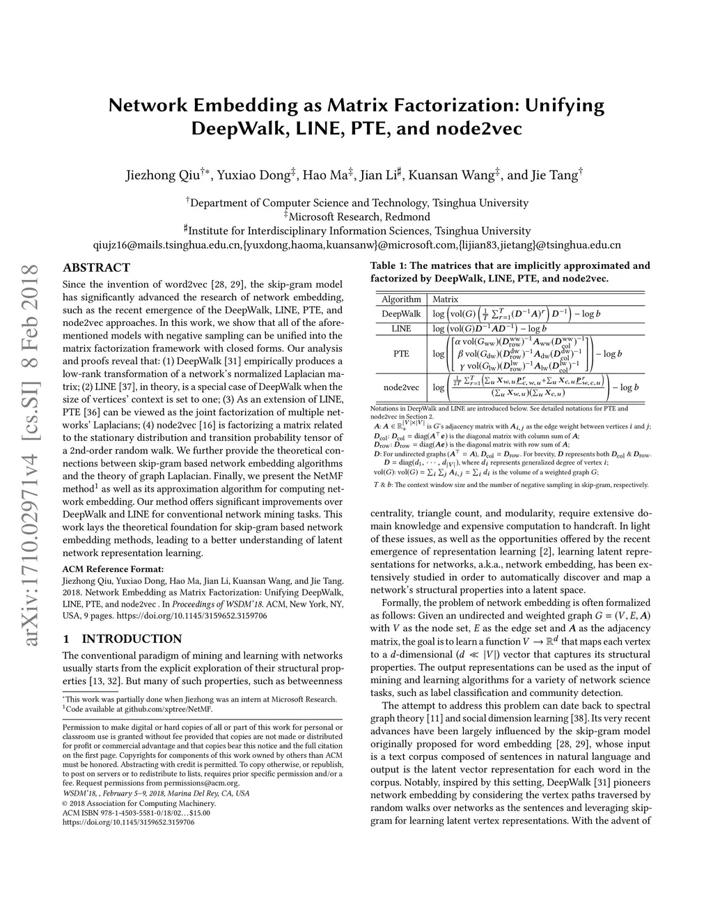 Network Embedding as Matrix Factorization: Unifying DeepWalk, LINE, PTE,
