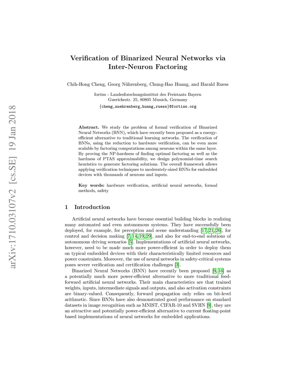 We study the problem of formal verification of Binarized Neural Networks (BNN), which have recently been proposed as a energy-efficient alternative to traditional learning networks. The verification of BNNs, using the reduction to hardware verification, can be even more scalable by factoring computations among neurons within the same layer. By proving the NP-hardness of finding optimal factoring as well as the hardness of PTAS approximability, we design polynomial-time search heuristics to generate factoring solutions. The overall framework allows applying verification techniques to moderately-sized BNNs for embedded devices with thousands of neurons and inputs.