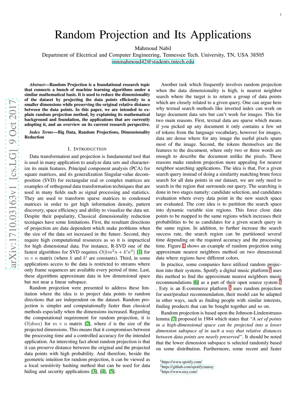 Random Projection is a foundational research topic that connects a bunch of machine learning algorithms under a similar mathematical basis. It is used to reduce the dimensionality of the dataset by projecting the data points efficiently to a smaller dimensions while preserving the original relative distance between the data points. In this paper, we are intended to explain random projection method, by explaining its mathematical background and foundation, the applications that are currently adopting it, and an overview on its current research perspective.