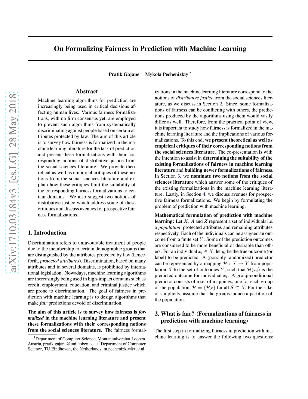 On Formalizing Fairness in Prediction with Machine Learning
