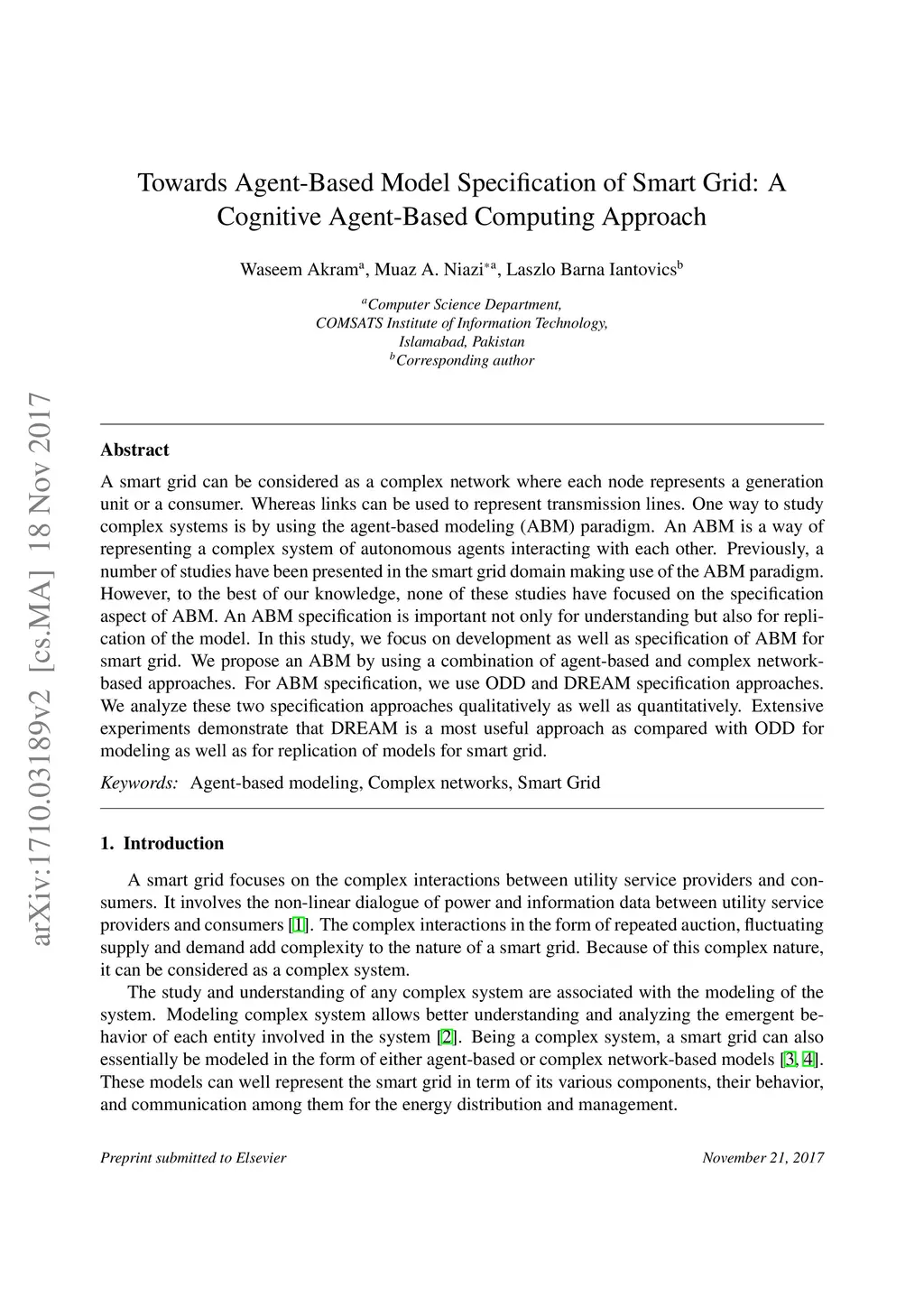 Towards Agent-Based Model Specification in Smart Grid: A Cognitive