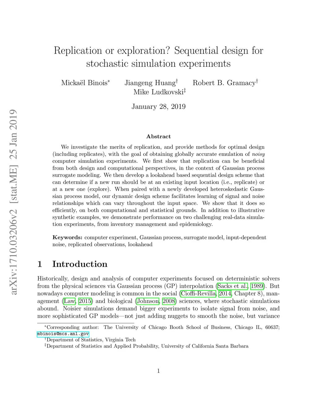 We investigate the merits of replication, and provide methods for optimal design (including replicates), with the goal of obtaining globally accurate emulation of noisy computer simulation experiments. We first show that replication can be beneficial from both design and computational perspectives, in the context of Gaussian process surrogate modeling. We then develop a lookahead based sequential design scheme that can determine if a new run should be at an existing input location (i.e., replicate) or at a new one (explore). When paired with a newly developed heteroskedastic Gaussian process model, our dynamic design scheme facilitates learning of signal and noise relationships which can vary throughout the input space. We show that it does so efficiently, on both computational and statistical grounds. In addition to illustrative synthetic examples, we demonstrate performance on two challenging real-data simulation experiments, from inventory management and epidemiology.