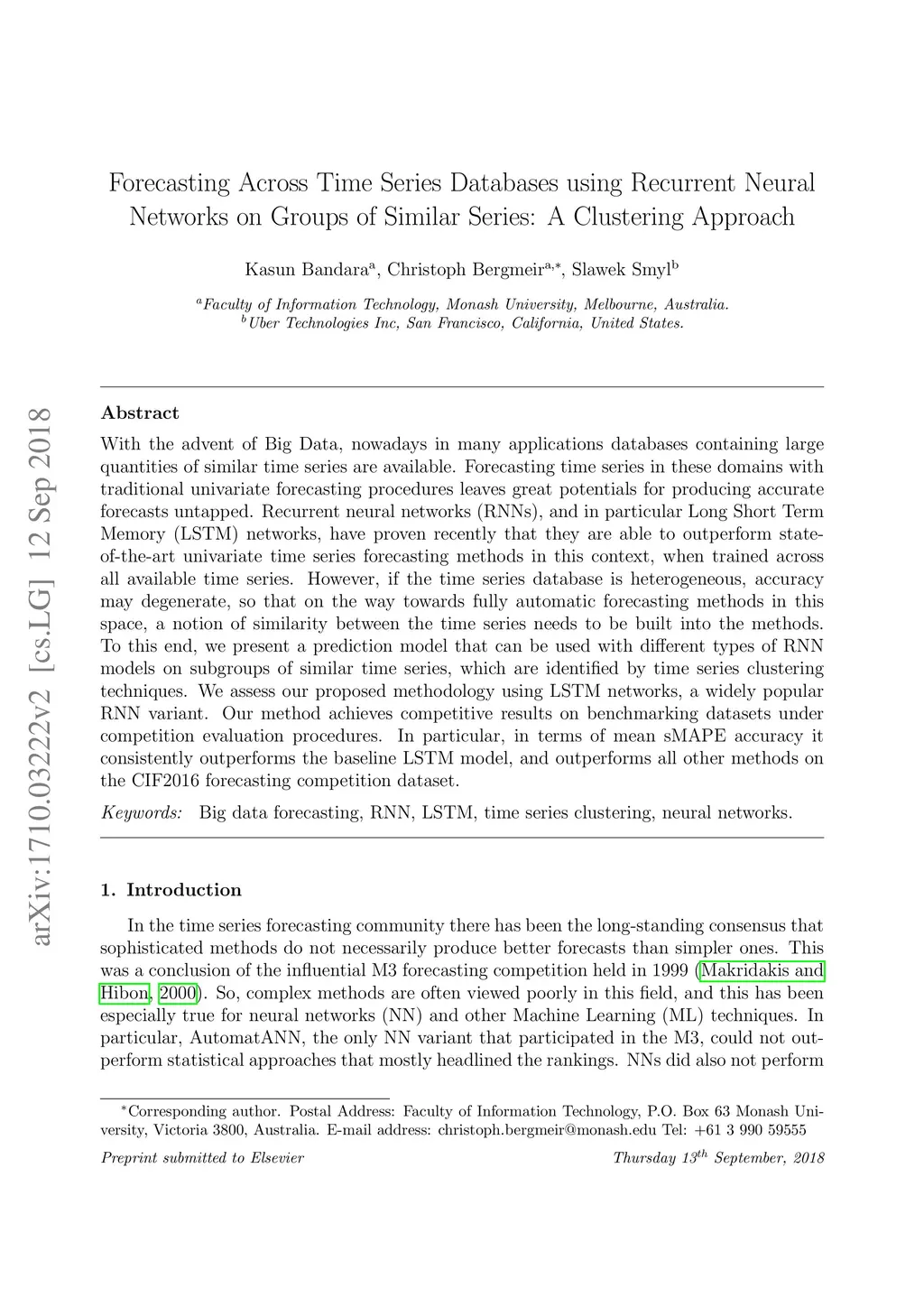 With the advent of Big Data, nowadays in many applications databases containing large quantities of similar time series are available. Forecasting time series in these domains with traditional univariate forecasting procedures leaves great potentials for producing accurate forecasts untapped. Recurrent neural networks, and in particular Long Short-Term Memory (LSTM) networks have proven recently that they are able to outperform state-of-the-art univariate time series forecasting methods in this context, when trained across all available time series. However, if the time series database is heterogeneous accuracy may degenerate, so that on the way towards fully automatic forecasting methods in this space, a notion of similarity between the time series needs to be built into the methods. To this end, we present a prediction model using LSTMs on subgroups of similar time series, which are identified by time series clustering techniques. The proposed methodology is able to consistently outperform the baseline LSTM model, and it achieves competitive results on benchmarking datasets, in particular outperforming all other methods on the CIF2016 dataset.