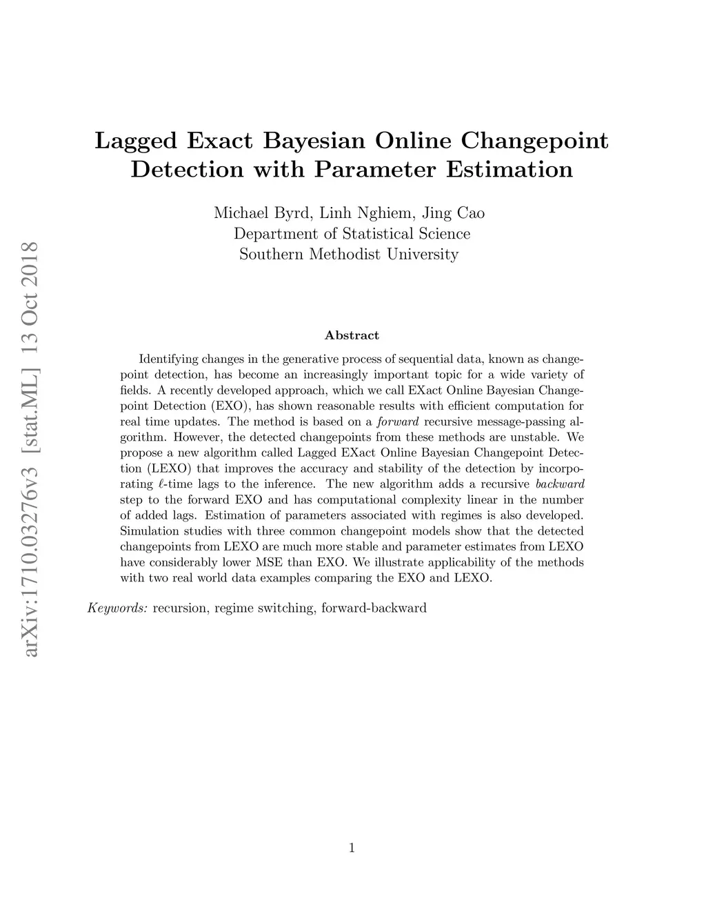 Identifying changes in the generative process of sequential data, known as changepoint detection, has become an increasingly important topic for a wide variety of fields. A recently developed approach, which we call EXact Online Bayesian Changepoint Detection (EXO), has shown reasonable results with efficient computation for real time updates. The method is based on a \textit{forward} recursive message-passing algorithm. However, the detected changepoints from these methods are unstable. We propose a new algorithm called Lagged EXact Online Bayesian Changepoint Detection (LEXO) that improves the accuracy and stability of the detection by incorporating -time lags to the inference. The new algorithm adds a recursive \textit{backward} step to the forward EXO and has computational complexity linear in the number of added lags. Estimation of parameters associated with regimes is also developed. Simulation studies with three common changepoint models show that the detected changepoints from LEXO are much more stable and parameter estimates from LEXO have considerably lower MSE than EXO. We illustrate applicability of the methods with two real world data examples comparing the EXO and LEXO.