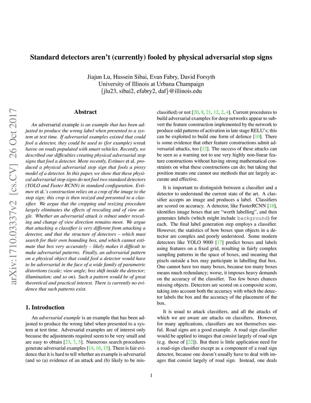 An adversarial example is an example that has been adjusted to produce the wrong label when presented to a system at test time. If adversarial examples existed that could fool a detector, they could be used to (for example) wreak havoc on roads populated with smart vehicles. Recently, we described our difficulties creating physical adversarial stop signs that fool a detector. More recently, Evtimov et al. produced a physical adversarial stop sign that fools a proxy model of a detector. In this paper, we show that these physical adversarial stop signs do not fool two standard detectors (YOLO and Faster RCNN) in standard configuration. Evtimov et al.'s construction relies on a crop of the image to the stop sign; this crop is then resized and presented to a classifier. We argue that the cropping and resizing procedure largely eliminates the effects of rescaling and of view angle. Whether an adversarial attack is robust under rescaling and change of view direction remains moot. We argue that attacking a classifier is very different from attacking a detector, and that the structure of detectors - which must search for their own bounding box, and which cannot estimate that box very accurately - likely makes it difficult to make adversarial patterns. Finally, an adversarial pattern on a physical object that could fool a detector would have to be adversarial in the face of a wide family of parametric distortions (scale; view angle; box shift inside the detector; illumination; and so on). Such a pattern would be of great theoretical and practical interest. There is currently no evidence that such patterns exist.