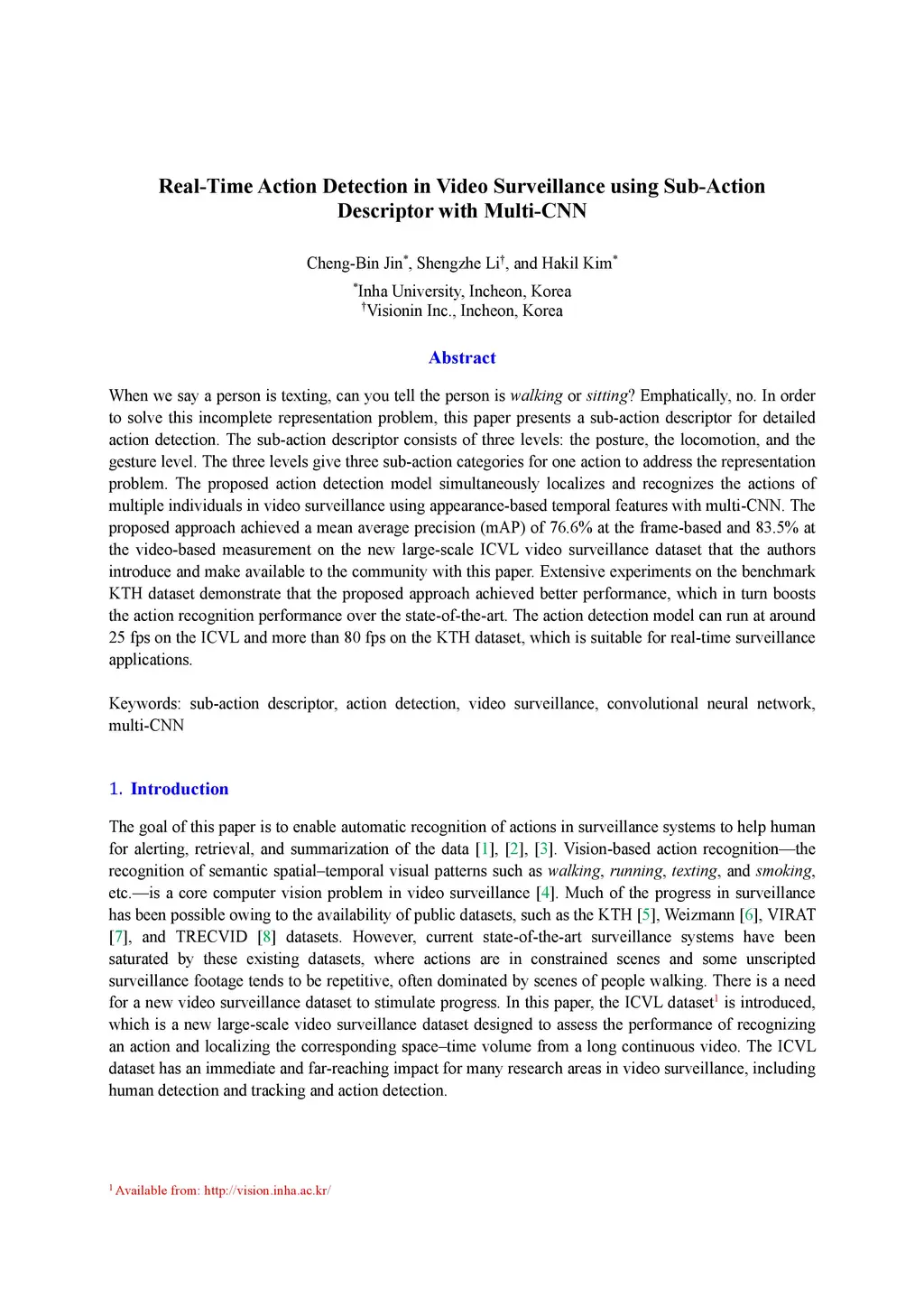 When we say a person is texting, can you tell the person is walking or sitting? Emphatically, no. In order to solve this incomplete representation problem, this paper presents a sub-action descriptor for detailed action detection. The sub-action descriptor consists of three levels: the posture, the locomotion, and the gesture level. The three levels give three sub-action categories for one action to address the representation problem. The proposed action detection model simultaneously localizes and recognizes the actions of multiple individuals in video surveillance using appearance-based temporal features with multi-CNN. The proposed approach achieved a mean average precision (mAP) of 76.6% at the frame-based and 83.5% at the video-based measurement on the new large-scale ICVL video surveillance dataset that the authors introduce and make available to the community with this paper. Extensive experiments on the benchmark KTH dataset demonstrate that the proposed approach achieved better performance, which in turn boosts the action recognition performance over the state-of-the-art. The action detection model can run at around 25 fps on the ICVL and more than 80 fps on the KTH dataset, which is suitable for real-time surveillance applications.