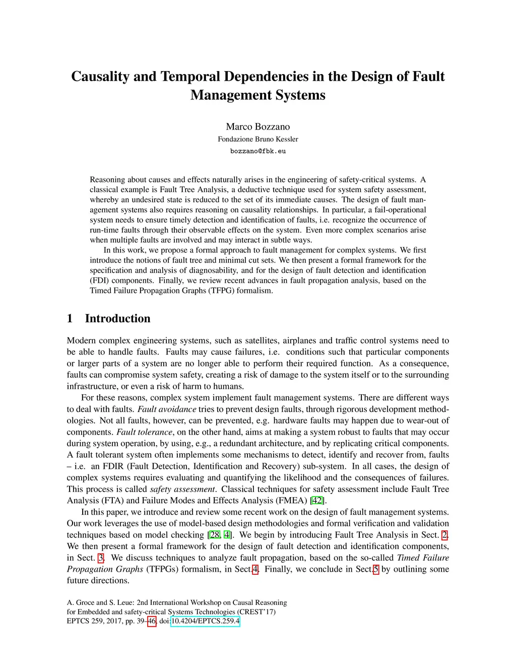 Reasoning about causes and effects naturally arises in the engineering of safety-critical systems. A classical example is Fault Tree Analysis, a deductive technique used for system safety assessment, whereby an undesired state is reduced to the set of its immediate causes. The design of fault management systems also requires reasoning on causality relationships. In particular, a fail-operational system needs to ensure timely detection and identification of faults, i.e. recognize the occurrence of run-time faults through their observable effects on the system. Even more complex scenarios arise when multiple faults are involved and may interact in subtle ways. In this work, we propose a formal approach to fault management for complex systems. We first introduce the notions of fault tree and minimal cut sets. We then present a formal framework for the specification and analysis of diagnosability, and for the design of fault detection and identification (FDI) components. Finally, we review recent advances in fault propagation analysis, based on the Timed Failure Propagation Graphs (TFPG) formalism.