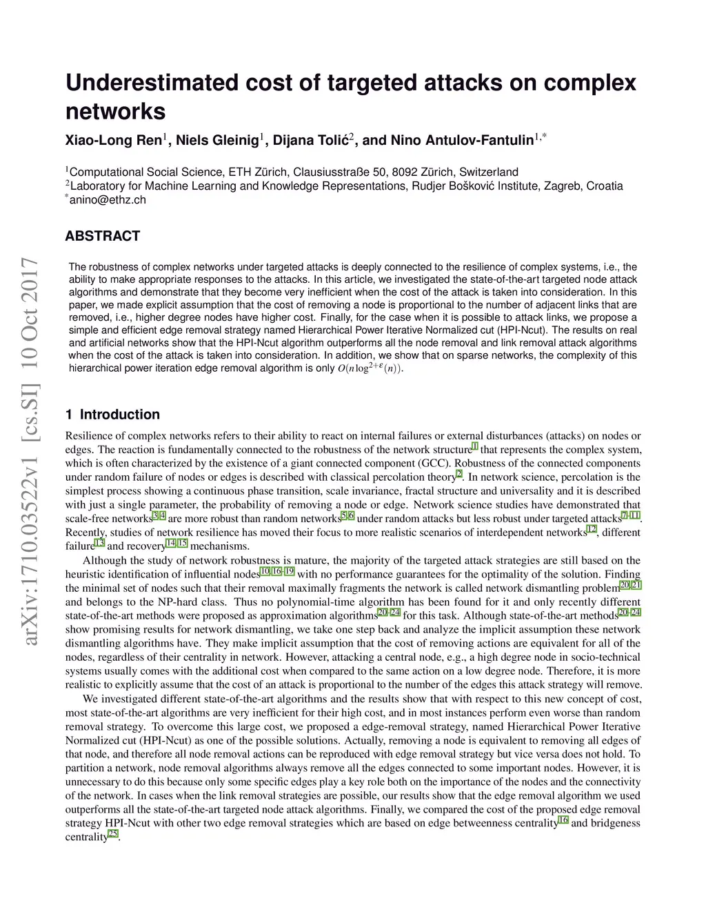 The robustness of complex networks under targeted attacks is deeply connected to the resilience of complex systems, i.e., the ability to make appropriate responses to the attacks. In this article, we investigated the state-of-the-art targeted node attack algorithms and demonstrate that they become very inefficient when the cost of the attack is taken into consideration. In this paper, we made explicit assumption that the cost of removing a node is proportional to the number of adjacent links that are removed, i.e., higher degree nodes have higher cost. Finally, for the case when it is possible to attack links, we propose a simple and efficient edge removal strategy named Hierarchical Power Iterative Normalized cut (HPI-Ncut).The results on real and artificial networks show that the HPI-Ncut algorithm outperforms all the node removal and link removal attack algorithms when the cost of the attack is taken into consideration. In addition, we show that on sparse networks, the complexity of this hierarchical power iteration edge removal algorithm is only .