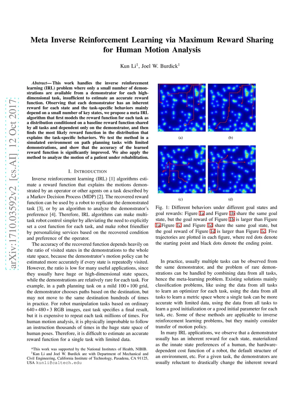 This work handles the inverse reinforcement learning (IRL) problem where only a small number of demonstrations are available from a demonstrator for each high-dimensional task, insufficient to estimate an accurate reward function. Observing that each demonstrator has an inherent reward for each state and the task-specific behaviors mainly depend on a small number of key states, we propose a meta IRL algorithm that first models the reward function for each task as a distribution conditioned on a baseline reward function shared by all tasks and dependent only on the demonstrator, and then finds the most likely reward function in the distribution that explains the task-specific behaviors. We test the method in a simulated environment on path planning tasks with limited demonstrations, and show that the accuracy of the learned reward function is significantly improved. We also apply the method to analyze the motion of a patient under rehabilitation.