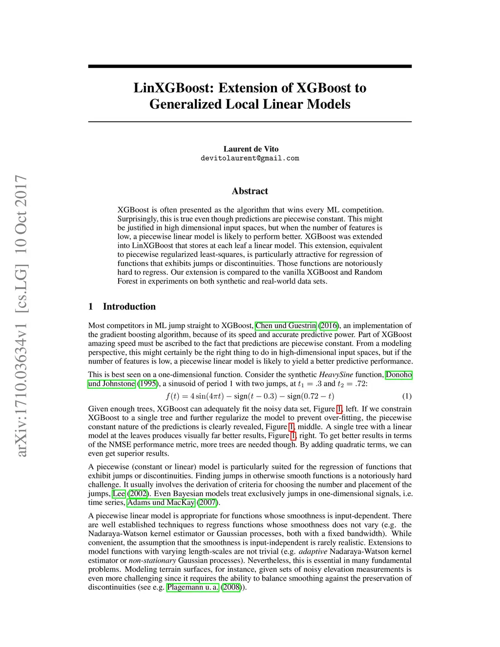 XGBoost is often presented as the algorithm that wins every ML competition. Surprisingly, this is true even though predictions are piecewise constant. This might be justified in high dimensional input spaces, but when the number of features is low, a piecewise linear model is likely to perform better. XGBoost was extended into LinXGBoost that stores at each leaf a linear model. This extension, equivalent to piecewise regularized least-squares, is particularly attractive for regression of functions that exhibits jumps or discontinuities. Those functions are notoriously hard to regress. Our extension is compared to the vanilla XGBoost and Random Forest in experiments on both synthetic and real-world data sets.