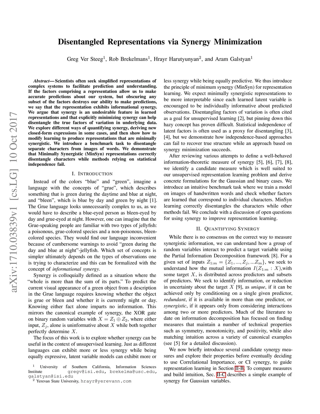 Scientists often seek simplified representations of complex systems to facilitate prediction and understanding. If the factors comprising a representation allow us to make accurate predictions about our system, but obscuring any subset of the factors destroys our ability to make predictions, we say that the representation exhibits informational synergy. We argue that synergy is an undesirable feature in learned representations and that explicitly minimizing synergy can help disentangle the true factors of variation underlying data. We explore different ways of quantifying synergy, deriving new closed-form expressions in some cases, and then show how to modify learning to produce representations that are minimally synergistic. We introduce a benchmark task to disentangle separate characters from images of words. We demonstrate that Minimally Synergistic (MinSyn) representations correctly disentangle characters while methods relying on statistical independence fail.