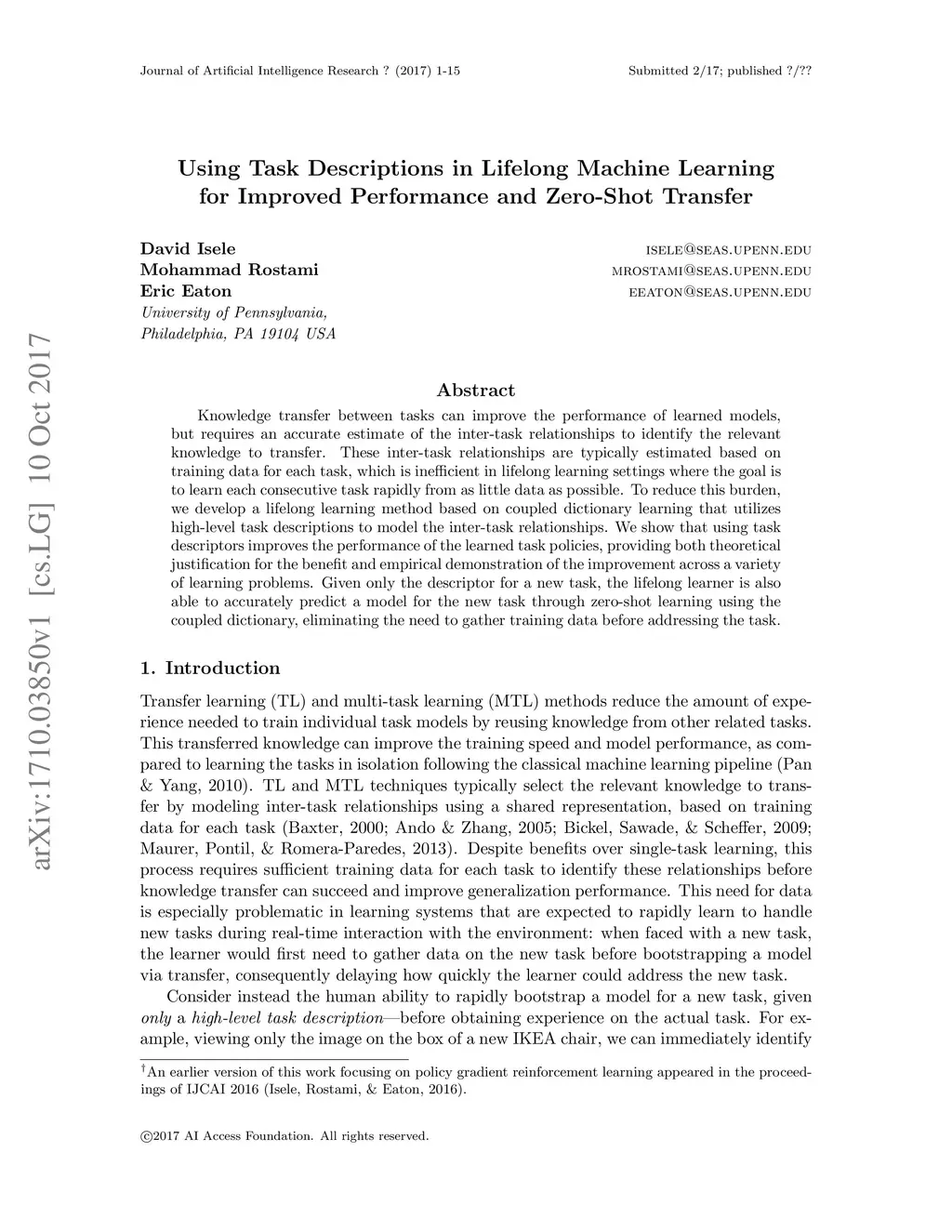 Knowledge transfer between tasks can improve the performance of learned models, but requires an accurate estimate of the inter-task relationships to identify the relevant knowledge to transfer. These inter-task relationships are typically estimated based on training data for each task, which is inefficient in lifelong learning settings where the goal is to learn each consecutive task rapidly from as little data as possible. To reduce this burden, we develop a lifelong learning method based on coupled dictionary learning that utilizes high-level task descriptions to model the inter-task relationships. We show that using task descriptors improves the performance of the learned task policies, providing both theoretical justification for the benefit and empirical demonstration of the improvement across a variety of learning problems. Given only the descriptor for a new task, the lifelong learner is also able to accurately predict a model for the new task through zero-shot learning using the coupled dictionary, eliminating the need to gather training data before addressing the task.