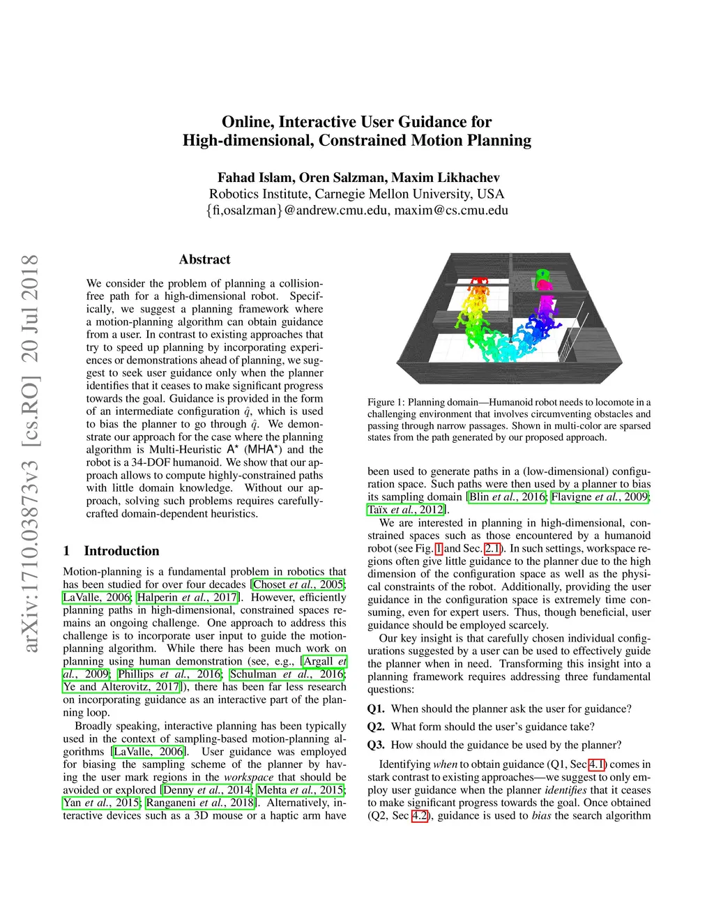 We consider the problem of planning a collision-free path for a high-dimensional robot. Specifically, we suggest a planning framework where a motion-planning algorithm can obtain guidance from a user. In contrast to existing approaches that try to speed up planning by incorporating experiences or demonstrations ahead of planning, we suggest to seek user guidance only when the planner identifies that it ceases to make significant progress towards the goal. Guidance is provided in the form of an intermediate configuration , which is used to bias the planner to go through . We demonstrate our approach for the case where the planning algorithm is Multi-Heuristic A* (MHA*) and the robot is a 34-DOF humanoid. We show that our approach allows to compute highly-constrained paths with little domain knowledge. Without our approach, solving such problems requires carefully-crafting domain-dependent heuristics.