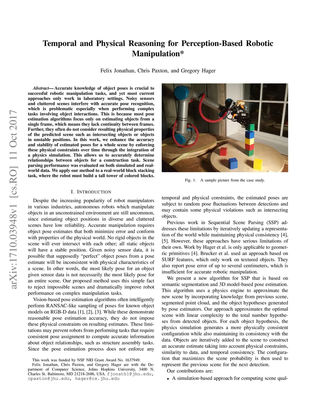 Accurate knowledge of object poses is crucial to successful robotic manipulation tasks, and yet most current approaches only work in laboratory settings. Noisy sensors and cluttered scenes interfere with accurate pose recognition, which is problematic especially when performing complex tasks involving object interactions. This is because most pose estimation algorithms focus only on estimating objects from a single frame, which means they lack continuity between frames. Further, they often do not consider resulting physical properties of the predicted scene such as intersecting objects or objects in unstable positions. In this work, we enhance the accuracy and stability of estimated poses for a whole scene by enforcing these physical constraints over time through the integration of a physics simulation. This allows us to accurately determine relationships between objects for a construction task. Scene parsing performance was evaluated on both simulated and real- world data. We apply our method to a real-world block stacking task, where the robot must build a tall tower of colored blocks.