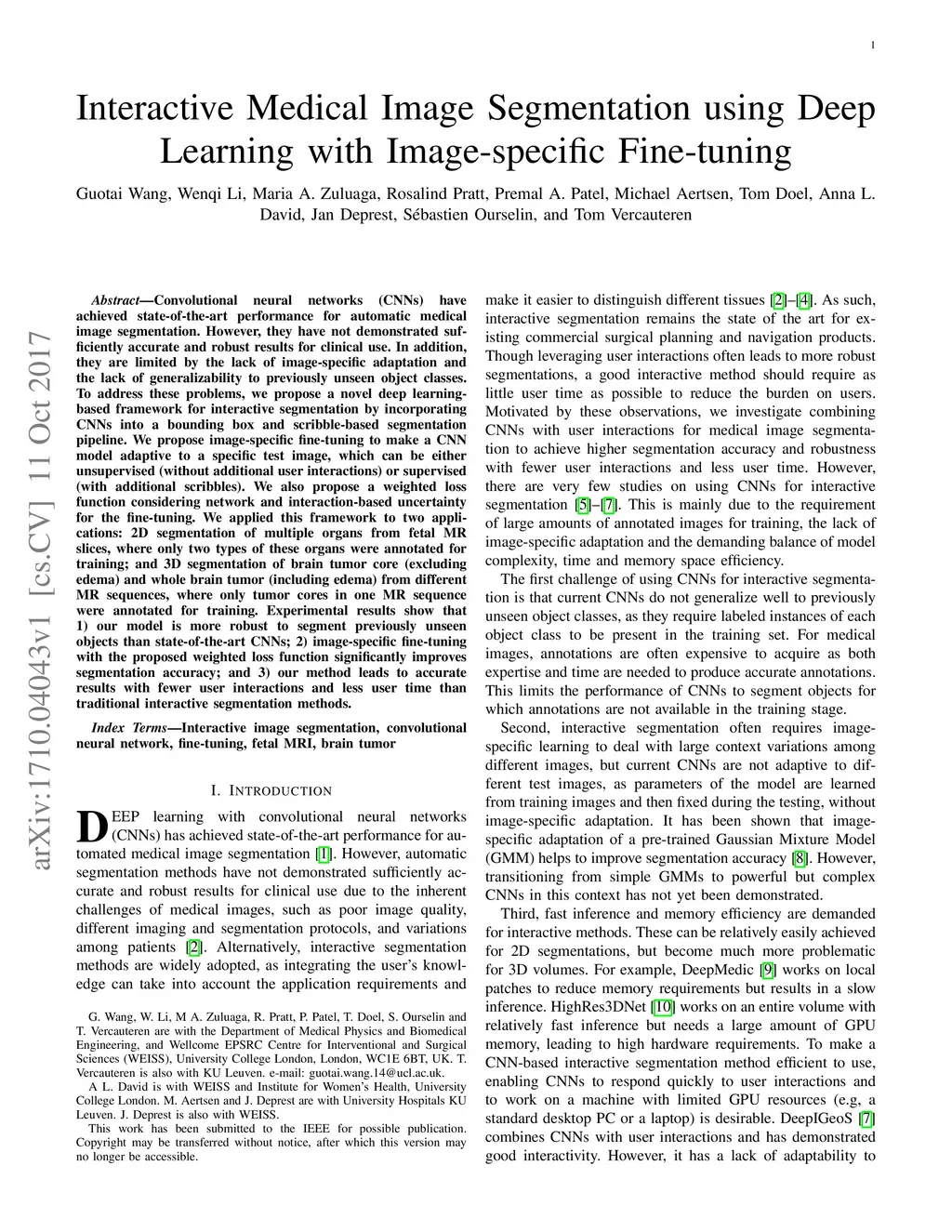 Convolutional neural networks (CNNs) have achieved state-of-the-art performance for automatic medical image segmentation. However, they have not demonstrated sufficiently accurate and robust results for clinical use. In addition, they are limited by the lack of image-specific adaptation and the lack of generalizability to previously unseen object classes. To address these problems, we propose a novel deep learning-based framework for interactive segmentation by incorporating CNNs into a bounding box and scribble-based segmentation pipeline. We propose image-specific fine-tuning to make a CNN model adaptive to a specific test image, which can be either unsupervised (without additional user interactions) or supervised (with additional scribbles). We also propose a weighted loss function considering network and interaction-based uncertainty for the fine-tuning. We applied this framework to two applications: 2D segmentation of multiple organs from fetal MR slices, where only two types of these organs were annotated for training; and 3D segmentation of brain tumor core (excluding edema) and whole brain tumor (including edema) from different MR sequences, where only tumor cores in one MR sequence were annotated for training. Experimental results show that 1) our model is more robust to segment previously unseen objects than state-of-the-art CNNs; 2) image-specific fine-tuning with the proposed weighted loss function significantly improves segmentation accuracy; and 3) our method leads to accurate results with fewer user interactions and less user time than traditional interactive segmentation methods.