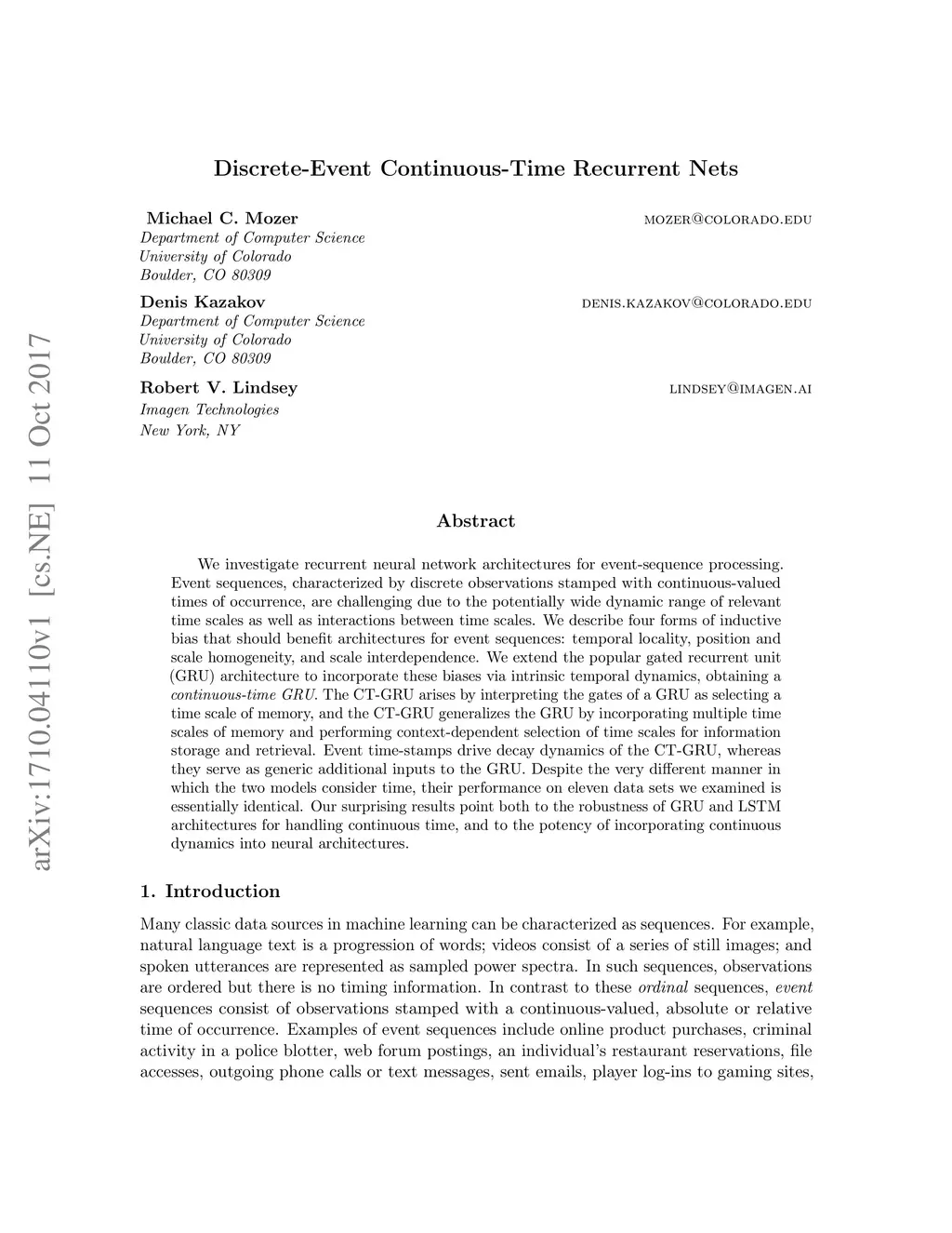 We investigate recurrent neural network architectures for event-sequence processing. Event sequences, characterized by discrete observations stamped with continuous-valued times of occurrence, are challenging due to the potentially wide dynamic range of relevant time scales as well as interactions between time scales. We describe four forms of inductive bias that should benefit architectures for event sequences: temporal locality, position and scale homogeneity, and scale interdependence. We extend the popular gated recurrent unit (GRU) architecture to incorporate these biases via intrinsic temporal dynamics, obtaining a continuous-time GRU. The CT-GRU arises by interpreting the gates of a GRU as selecting a time scale of memory, and the CT-GRU generalizes the GRU by incorporating multiple time scales of memory and performing context-dependent selection of time scales for information storage and retrieval. Event time-stamps drive decay dynamics of the CT-GRU, whereas they serve as generic additional inputs to the GRU. Despite the very different manner in which the two models consider time, their performance on eleven data sets we examined is essentially identical. Our surprising results point both to the robustness of GRU and LSTM architectures for handling continuous time, and to the potency of incorporating continuous dynamics into neural architectures.