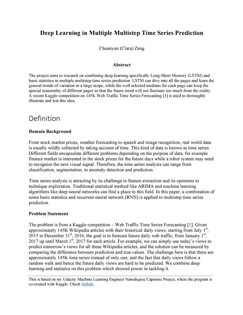 The project aims to research on combining deep learning specifically Long-Short Memory (LSTM) and basic statistics in multiple multistep time series prediction. LSTM can dive into all the pages and learn the general trends of variation in a large scope, while the well selected medians for each page can keep the special seasonality of different pages so that the future trend will not fluctuate too much from the reality. A recent Kaggle competition on 145K Web Traffic Time Series Forecasting [1] is used to thoroughly illustrate and test this idea.
