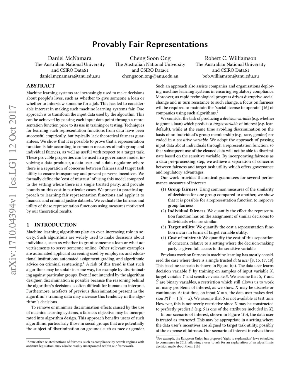 Machine learning systems are increasingly used to make decisions about people's lives, such as whether to give someone a loan or whether to interview someone for a job. This has led to considerable interest in making such machine learning systems fair. One approach is to transform the input data used by the algorithm. This can be achieved by passing each input data point through a representation function prior to its use in training or testing. Techniques for learning such representation functions from data have been successful empirically, but typically lack theoretical fairness guarantees. We show that it is possible to prove that a representation function is fair according to common measures of both group and individual fairness, as well as useful with respect to a target task. These provable properties can be used in a governance model involving a data producer, a data user and a data regulator, where there is a separation of concerns between fairness and target task utility to ensure transparency and prevent perverse incentives. We formally define the 'cost of mistrust' of using this model compared to the setting where there is a single trusted party, and provide bounds on this cost in particular cases. We present a practical approach to learning fair representation functions and apply it to financial and criminal justice datasets. We evaluate the fairness and utility of these representation functions using measures motivated by our theoretical results.