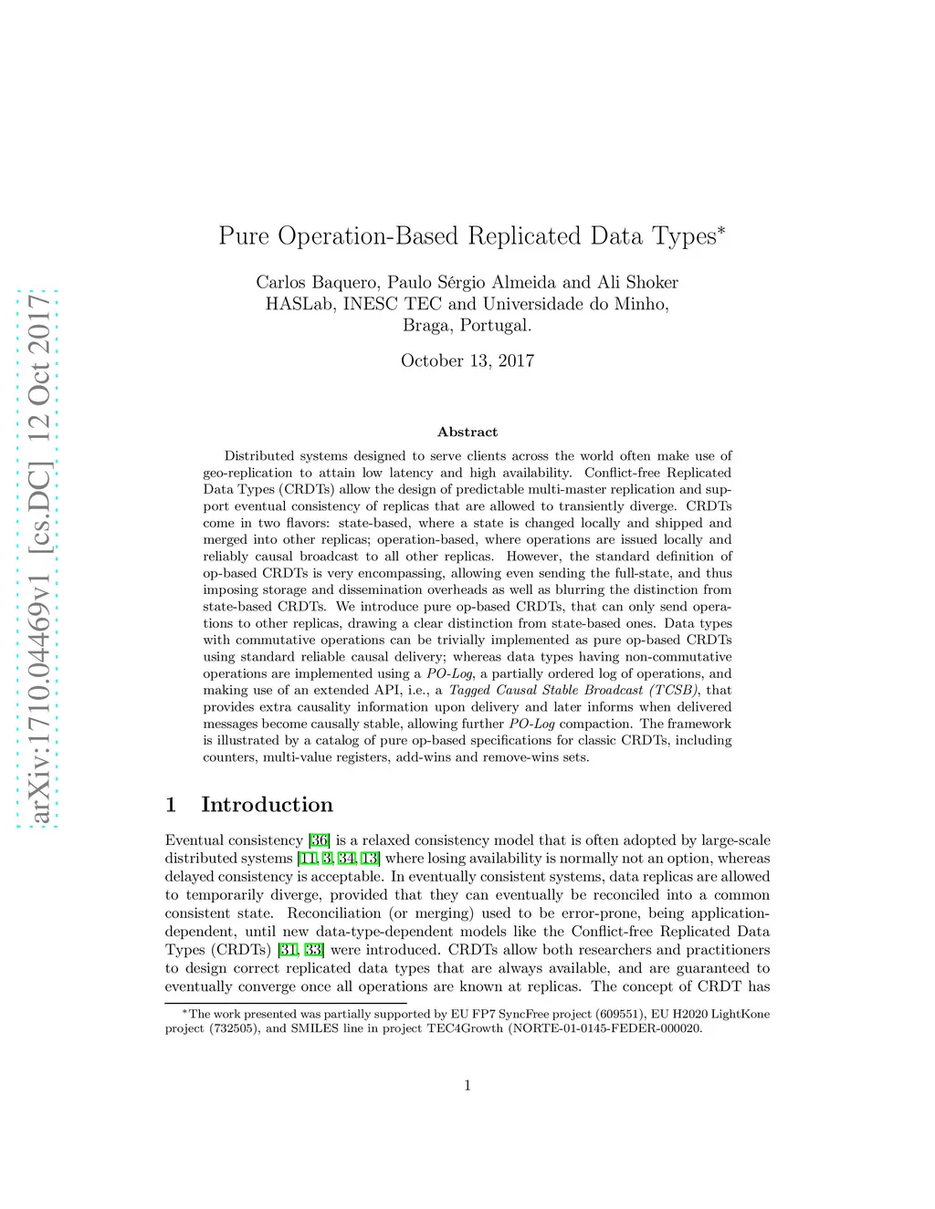 Distributed systems designed to serve clients across the world often make use of geo-replication to attain low latency and high availability. Conflict-free Replicated Data Types (CRDTs) allow the design of predictable multi-master replication and support eventual consistency of replicas that are allowed to transiently diverge. CRDTs come in two flavors: state-based, where a state is changed locally and shipped and merged into other replicas; operation-based, where operations are issued locally and reliably causal broadcast to all other replicas. However, the standard definition of op-based CRDTs is very encompassing, allowing even sending the full-state, and thus imposing storage and dissemination overheads as well as blurring the distinction from state-based CRDTs. We introduce pure op-based CRDTs, that can only send operations to other replicas, drawing a clear distinction from state-based ones. Data types with commutative operations can be trivially implemented as pure op-based CRDTs using standard reliable causal delivery; whereas data types having non-commutative operations are implemented using a PO-Log, a partially ordered log of operations, and making use of an extended API, i.e., a Tagged Causal Stable Broadcast (TCSB), that provides extra causality information upon delivery and later informs when delivered messages become causally stable, allowing further PO-Log compaction. The framework is illustrated by a catalog of pure op-based specifications for classic CRDTs, including counters, multi-value registers, add-wins and remove-wins sets.