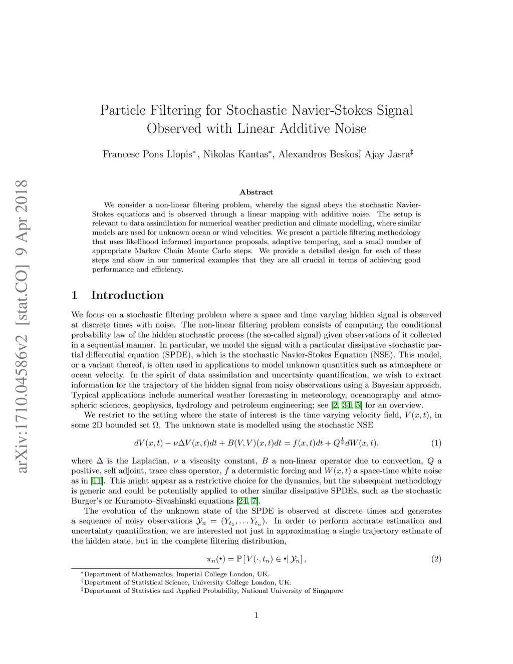 Particle Filtering for Stochastic Navier-Stokes Signal Observed with