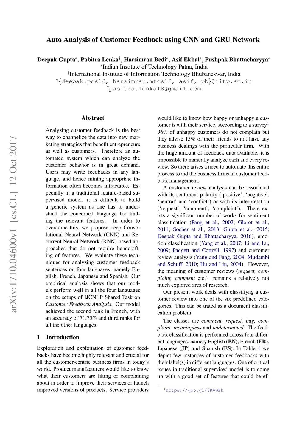 Auto Analysis of Customer Feedback using CNN and GRU Network