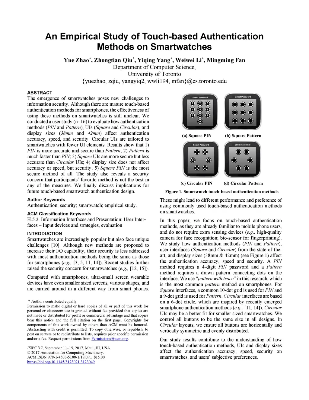 The emergence of smartwatches poses new challenges to information security. Although there are mature touch-based authentication methods for smartphones, the effectiveness of using these methods on smartwatches is still unclear. We conducted a user study (n=16) to evaluate how authentication methods (PIN and Pattern), UIs (Square and Circular), and display sizes (38mm and 42mm) affect authentication accuracy, speed, and security. Circular UIs are tailored to smartwatches with fewer UI elements. Results show that 1) PIN is more accurate and secure than Pattern; 2) Pattern is much faster than PIN; 3) Square UIs are more secure but less accurate than Circular UIs; 4) display size does not affect accuracy or speed, but security; 5) Square PIN is the most secure method of all. The study also reveals a security concern that participants' favorite method is not the best in any of the measures. We finally discuss implications for future touch-based smartwatch authentication design.