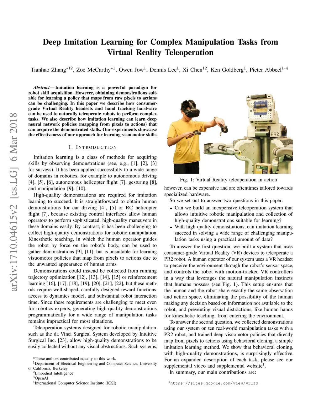 Imitation learning is a powerful paradigm for robot skill acquisition. However, obtaining demonstrations suitable for learning a policy that maps from raw pixels to actions can be challenging. In this paper we describe how consumer-grade Virtual Reality headsets and hand tracking hardware can be used to naturally teleoperate robots to perform complex tasks. We also describe how imitation learning can learn deep neural network policies (mapping from pixels to actions) that can acquire the demonstrated skills. Our experiments showcase the effectiveness of our approach for learning visuomotor skills.