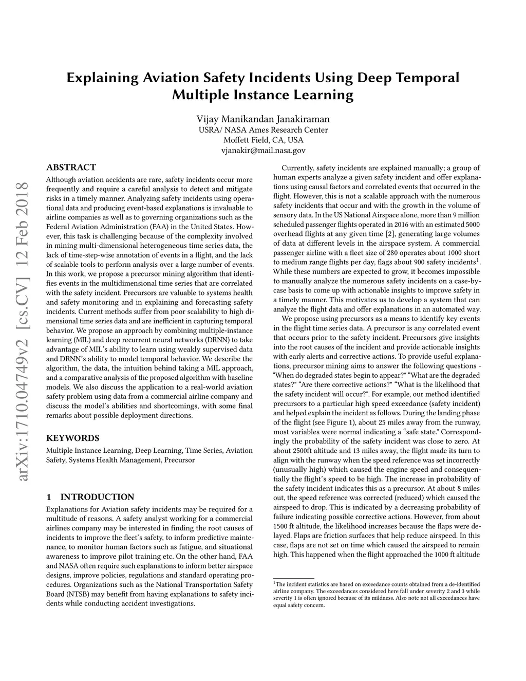 Although aviation accidents are rare, safety incidents occur more frequently and require a careful analysis to detect and mitigate risks in a timely manner. Analyzing safety incidents using operational data and producing event-based explanations is invaluable to airline companies as well as to governing organizations such as the Federal Aviation Administration (FAA) in the United States. However, this task is challenging because of the complexity involved in mining multi-dimensional heterogeneous time series data, the lack of time-step-wise annotation of events in a flight, and the lack of scalable tools to perform analysis over a large number of events. In this work, we propose a precursor mining algorithm that identifies events in the multidimensional time series that are correlated with the safety incident. Precursors are valuable to systems health and safety monitoring and in explaining and forecasting safety incidents. Current methods suffer from poor scalability to high dimensional time series data and are inefficient in capturing temporal behavior. We propose an approach by combining multiple-instance learning (MIL) and deep recurrent neural networks (DRNN) to take advantage of MIL's ability to learn using weakly supervised data and DRNN's ability to model temporal behavior. We describe the algorithm, the data, the intuition behind taking a MIL approach, and a comparative analysis of the proposed algorithm with baseline models. We also discuss the application to a real-world aviation safety problem using data from a commercial airline company and discuss the model's abilities and shortcomings, with some final remarks about possible deployment directions.