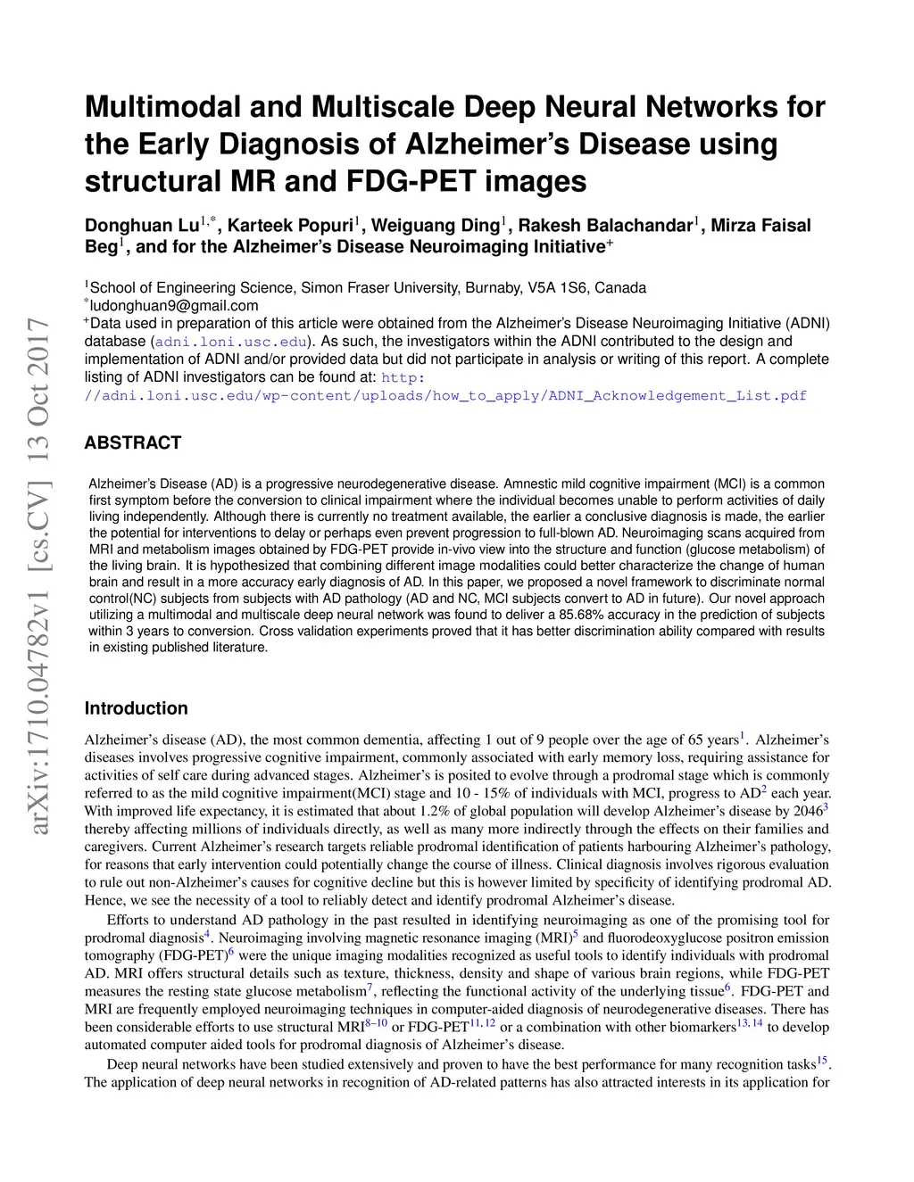 of Alzheimer's Disease using structural MR and FDG-PET images
