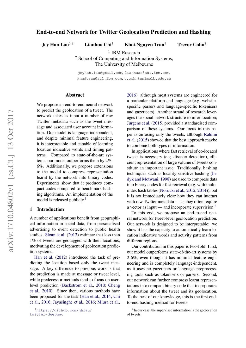End-to-end Network for Twitter Geolocation Prediction and Hashing