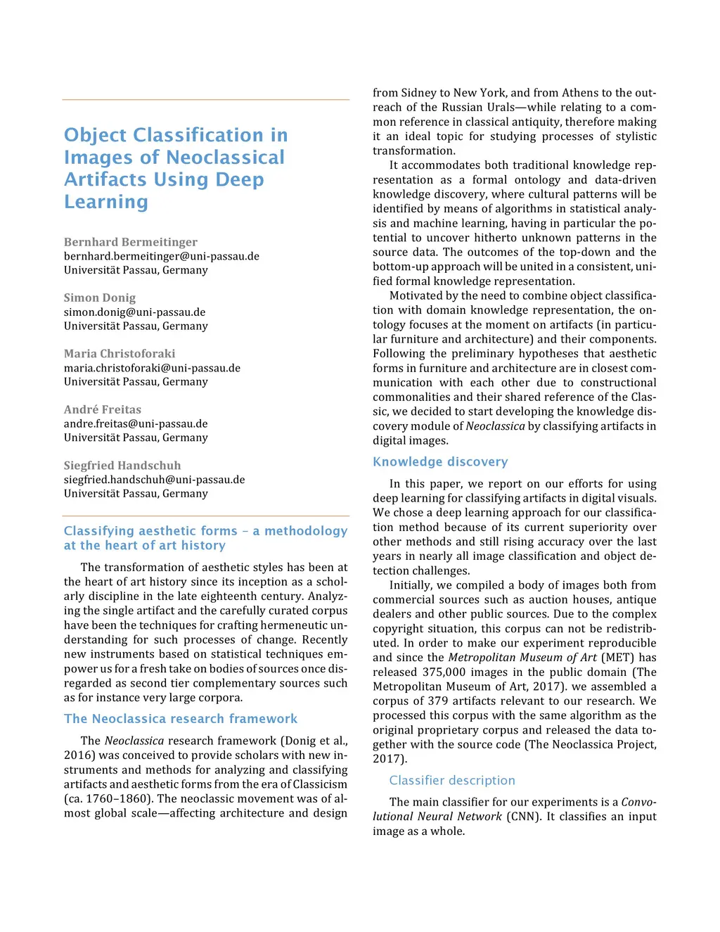 Object Classification in Images of Neoclassical Artifacts Using Deep