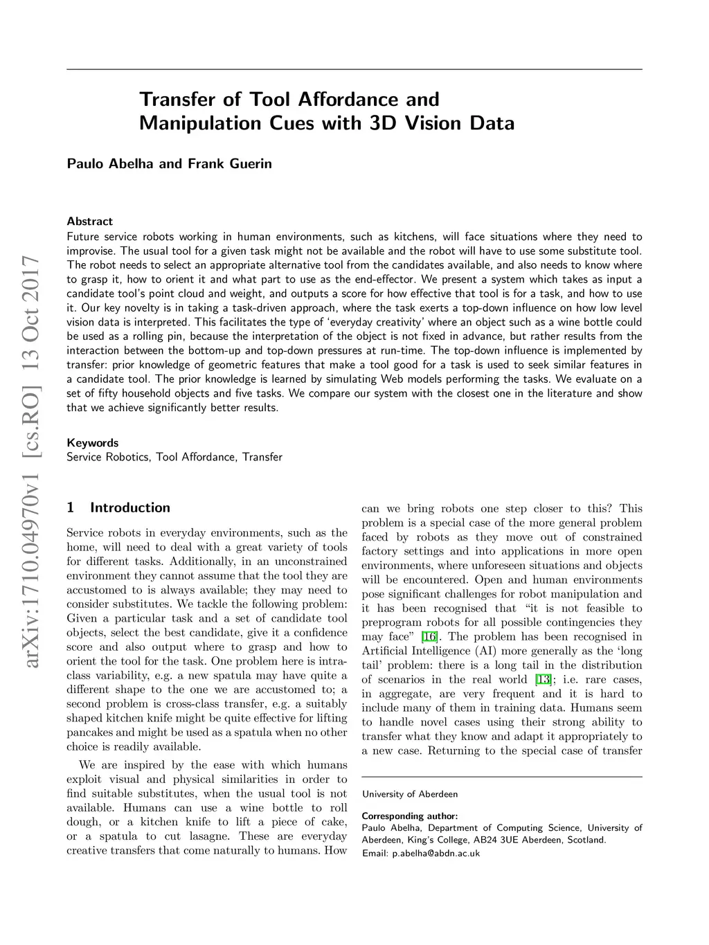 Transfer of Tool Affordance and Manipulation Cues with 3D Vision Data