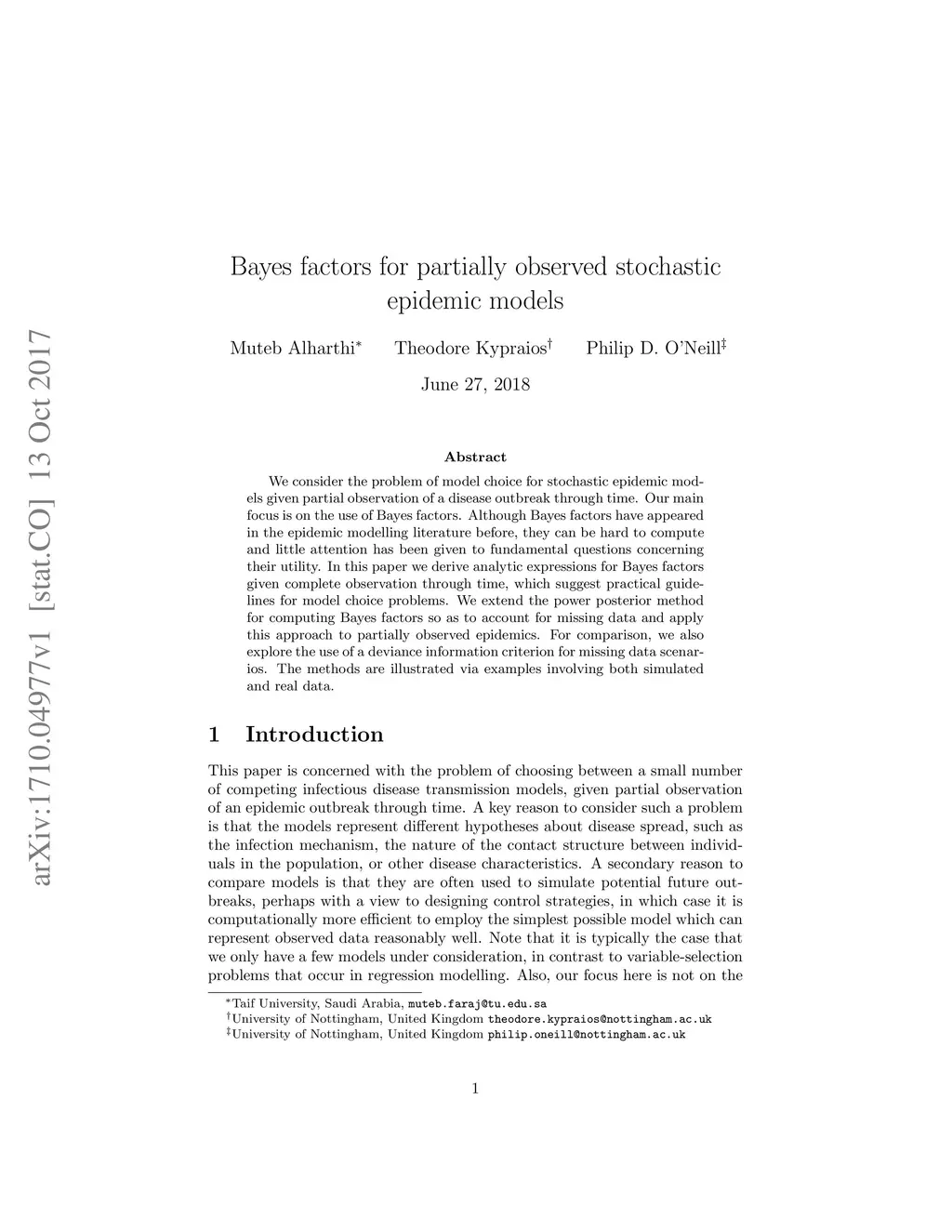 Bayes factors for partially observed stochastic epidemic models