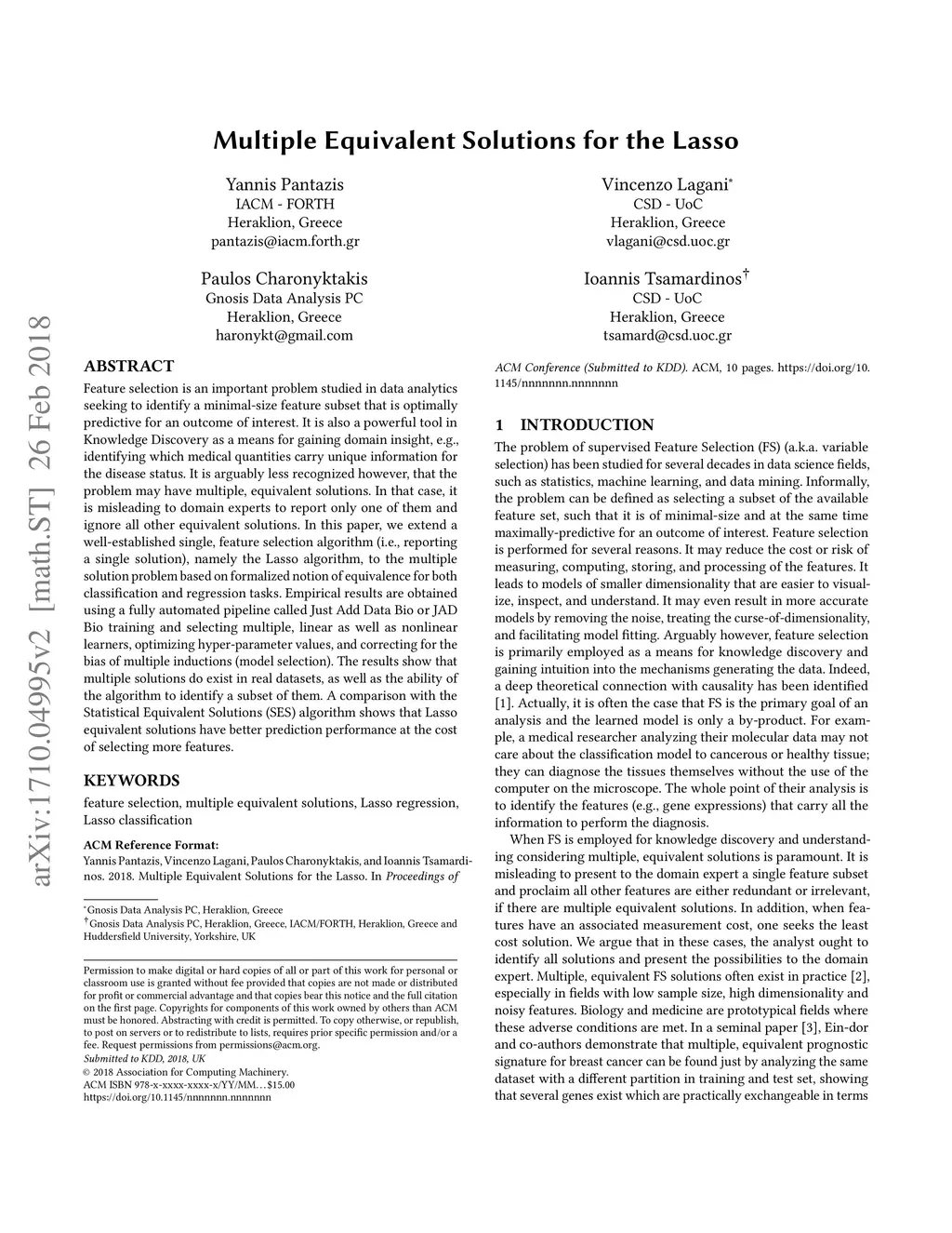 Feature selection is an important problem studied in data analytics seeking to identify a minimal-size feature subset that is optimally predictive for an outcome of interest. It is also a powerful tool in Knowledge Discovery as a means for gaining domain insight, e.g., identifying which medical quantities carry unique information for the disease status. It is arguably less recognized however, that the problem may have multiple, equivalent solutions. In that case, it is misleading to domain experts to report only one of them and ignore all other equivalent solutions. In this paper, we extend a well-established single, feature selection algorithm (i.e., reporting a single solution), namely the Lasso algorithm, to the multiple solution problem based on formalized notion of equivalence for both classification and regression tasks. Empirical results are obtained using a fully automated pipeline called Just Add Data Bio or JAD Bio training and selecting multiple, linear as well as nonlinear learners, optimizing hyper-parameter values, and correcting for the bias of multiple inductions (model selection). The results show that multiple solutions do exist in real datasets, as well as the ability of the algorithm to identify a subset of them. A comparison with the Statistical Equivalent Solutions (SES) algorithm shows that Lasso equivalent solutions have better prediction performance at the cost of selecting more features.