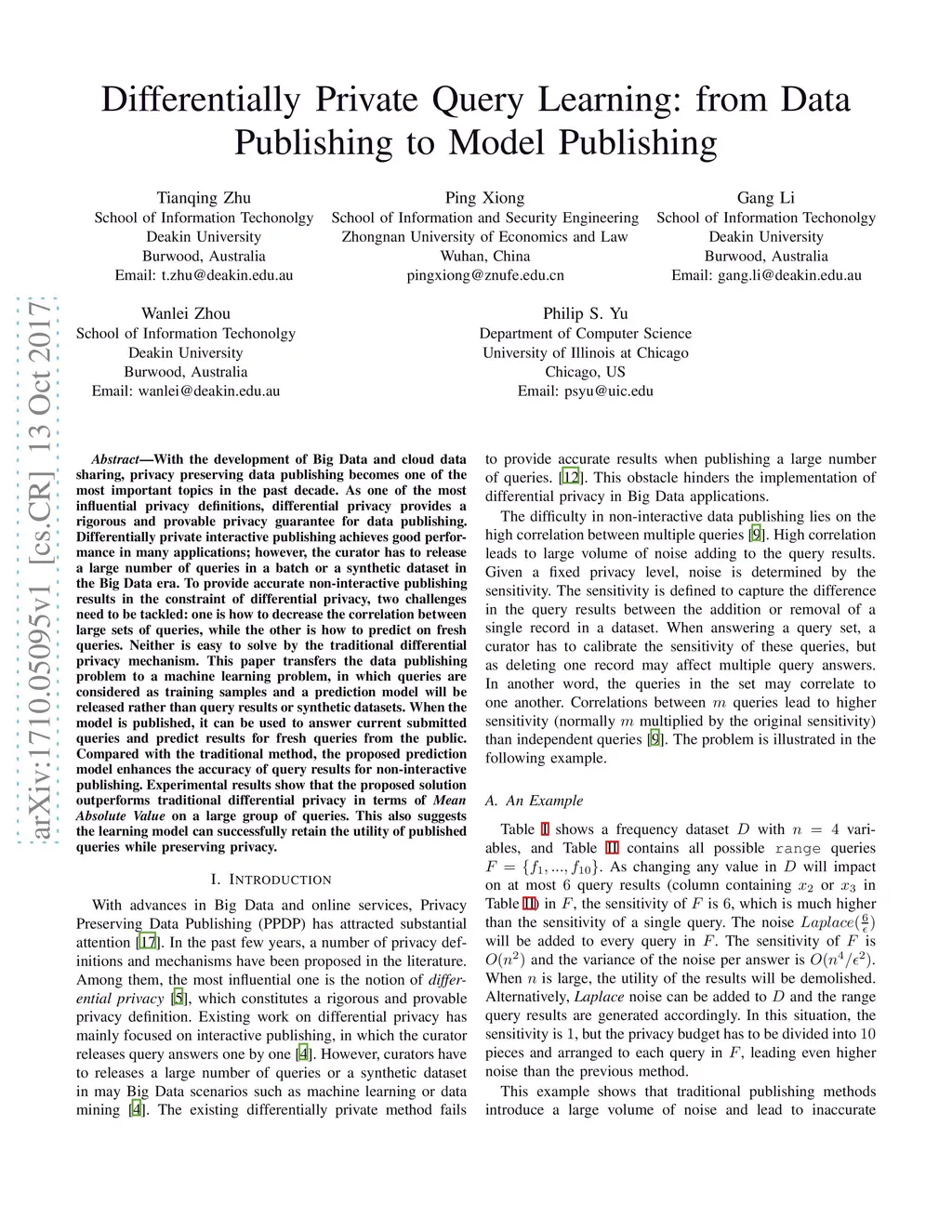 With the development of Big Data and cloud data sharing, privacy preserving data publishing becomes one of the most important topics in the past decade. As one of the most influential privacy definitions, differential privacy provides a rigorous and provable privacy guarantee for data publishing. Differentially private interactive publishing achieves good performance in many applications; however, the curator has to release a large number of queries in a batch or a synthetic dataset in the Big Data era. To provide accurate non-interactive publishing results in the constraint of differential privacy, two challenges need to be tackled: one is how to decrease the correlation between large sets of queries, while the other is how to predict on fresh queries. Neither is easy to solve by the traditional differential privacy mechanism. This paper transfers the data publishing problem to a machine learning problem, in which queries are considered as training samples and a prediction model will be released rather than query results or synthetic datasets. When the model is published, it can be used to answer current submitted queries and predict results for fresh queries from the public. Compared with the traditional method, the proposed prediction model enhances the accuracy of query results for non-interactive publishing. Experimental results show that the proposed solution outperforms traditional differential privacy in terms of Mean Absolute Value on a large group of queries. This also suggests the learning model can successfully retain the utility of published queries while preserving privacy.