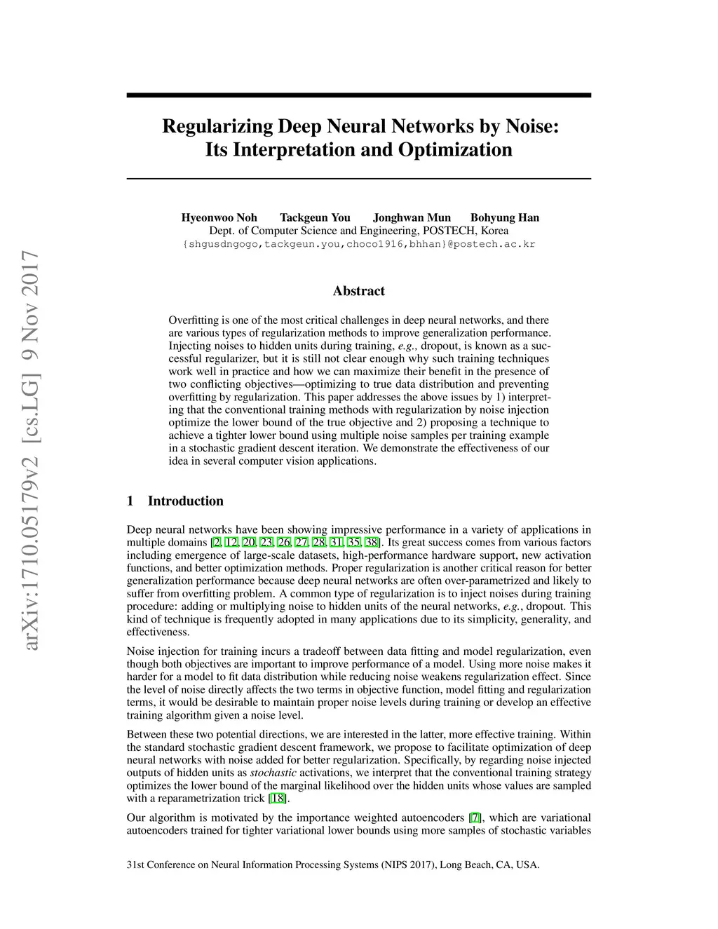 Overfitting is one of the most critical challenges in deep neural networks, and there are various types of regularization methods to improve generalization performance. Injecting noises to hidden units during training, e.g., dropout, is known as a successful regularizer, but it is still not clear enough why such training techniques work well in practice and how we can maximize their benefit in the presence of two conflicting objectives---optimizing to true data distribution and preventing overfitting by regularization. This paper addresses the above issues by 1) interpreting that the conventional training methods with regularization by noise injection optimize the lower bound of the true objective and 2) proposing a technique to achieve a tighter lower bound using multiple noise samples per training example in a stochastic gradient descent iteration. We demonstrate the effectiveness of our idea in several computer vision applications.