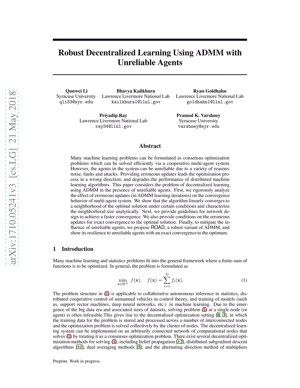 Many machine learning problems can be formulated as consensus optimization problems which can be solved efficiently via a cooperative multi-agent system. However, the agents in the system can be unreliable due to a variety of reasons: noise, faults and attacks. Providing erroneous updates leads the optimization process in a wrong direction, and degrades the performance of distributed machine learning algorithms. This paper considers the problem of decentralized learning using ADMM in the presence of unreliable agents. First, we rigorously analyze the effect of erroneous updates (in ADMM learning iterations) on the convergence behavior of multi-agent system. We show that the algorithm linearly converges to a neighborhood of the optimal solution under certain conditions and characterize the neighborhood size analytically. Next, we provide guidelines for network design to achieve a faster convergence. We also provide conditions on the erroneous updates for exact convergence to the optimal solution. Finally, to mitigate the influence of unreliable agents, we propose \textsf{ROAD}, a robust variant of ADMM, and show its resilience to unreliable agents with an exact convergence to the optimum.