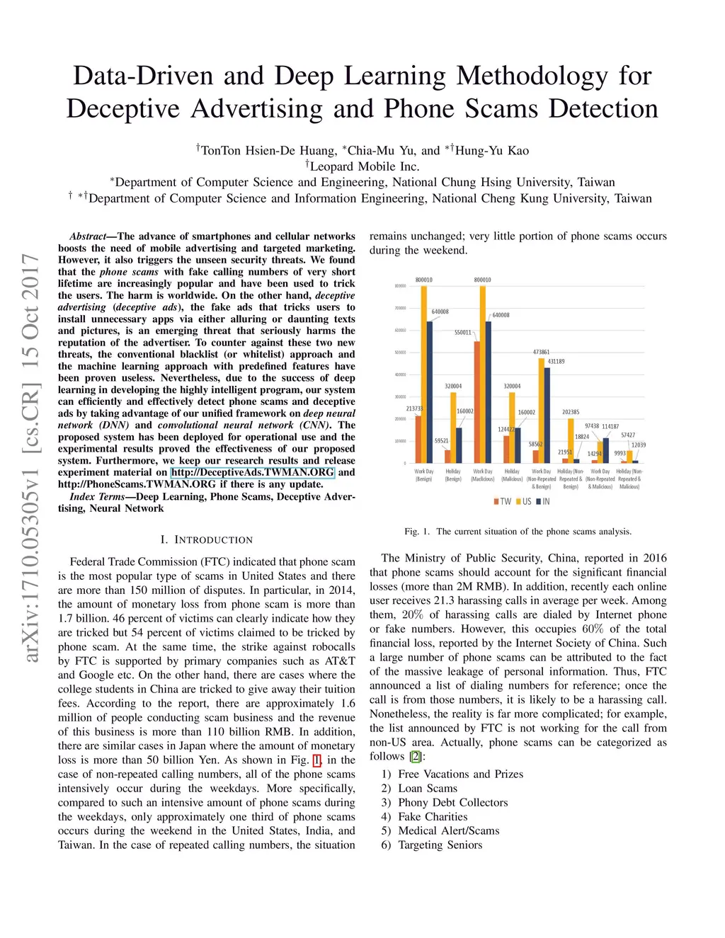 The advance of smartphones and cellular networks boosts the need of mobile advertising and targeted marketing. However, it also triggers the unseen security threats. We found that the phone scams with fake calling numbers of very short lifetime are increasingly popular and have been used to trick the users. The harm is worldwide. On the other hand, deceptive advertising (deceptive ads), the fake ads that tricks users to install unnecessary apps via either alluring or daunting texts and pictures, is an emerging threat that seriously harms the reputation of the advertiser. To counter against these two new threats, the conventional blacklist (or whitelist) approach and the machine learning approach with predefined features have been proven useless. Nevertheless, due to the success of deep learning in developing the highly intelligent program, our system can efficiently and effectively detect phone scams and deceptive ads by taking advantage of our unified framework on deep neural network (DNN) and convolutional neural network (CNN). The proposed system has been deployed for operational use and the experimental results proved the effectiveness of our proposed system. Furthermore, we keep our research results and release experiment material on http://DeceptiveAds.TWMAN.ORG and http://PhoneScams.TWMAN.ORG if there is any update.