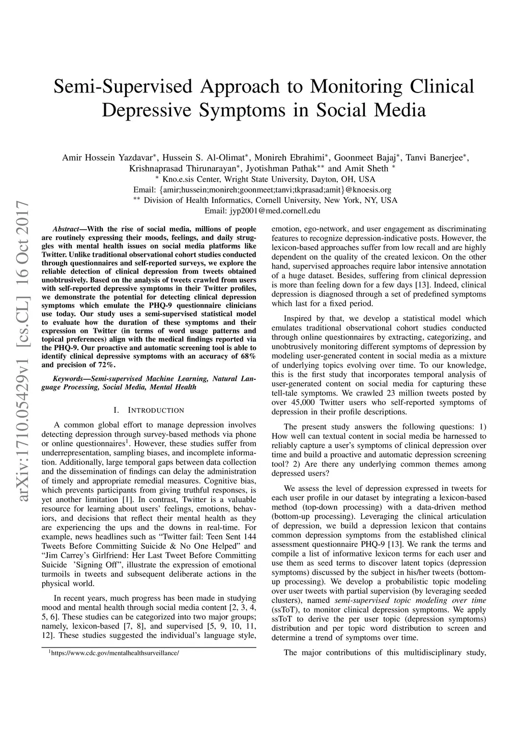 Semi-Supervised Approach to Monitoring Clinical Depressive Symptoms in