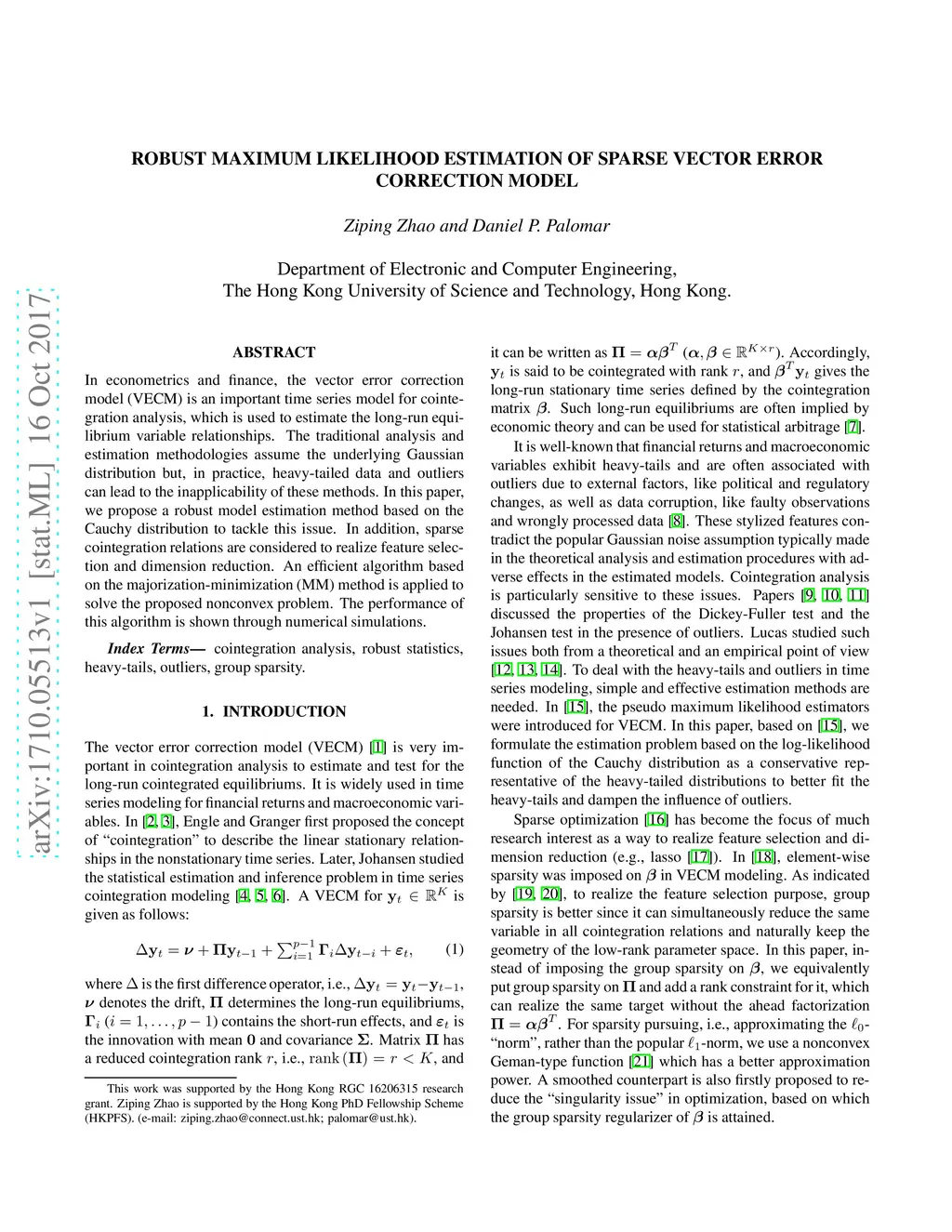 In econometrics and finance, the vector error correction model (VECM) is an important time series model for cointegration analysis, which is used to estimate the long-run equilibrium variable relationships. The traditional analysis and estimation methodologies assume the underlying Gaussian distribution but, in practice, heavy-tailed data and outliers can lead to the inapplicability of these methods. In this paper, we propose a robust model estimation method based on the Cauchy distribution to tackle this issue. In addition, sparse cointegration relations are considered to realize feature selection and dimension reduction. An efficient algorithm based on the majorization-minimization (MM) method is applied to solve the proposed nonconvex problem. The performance of this algorithm is shown through numerical simulations.