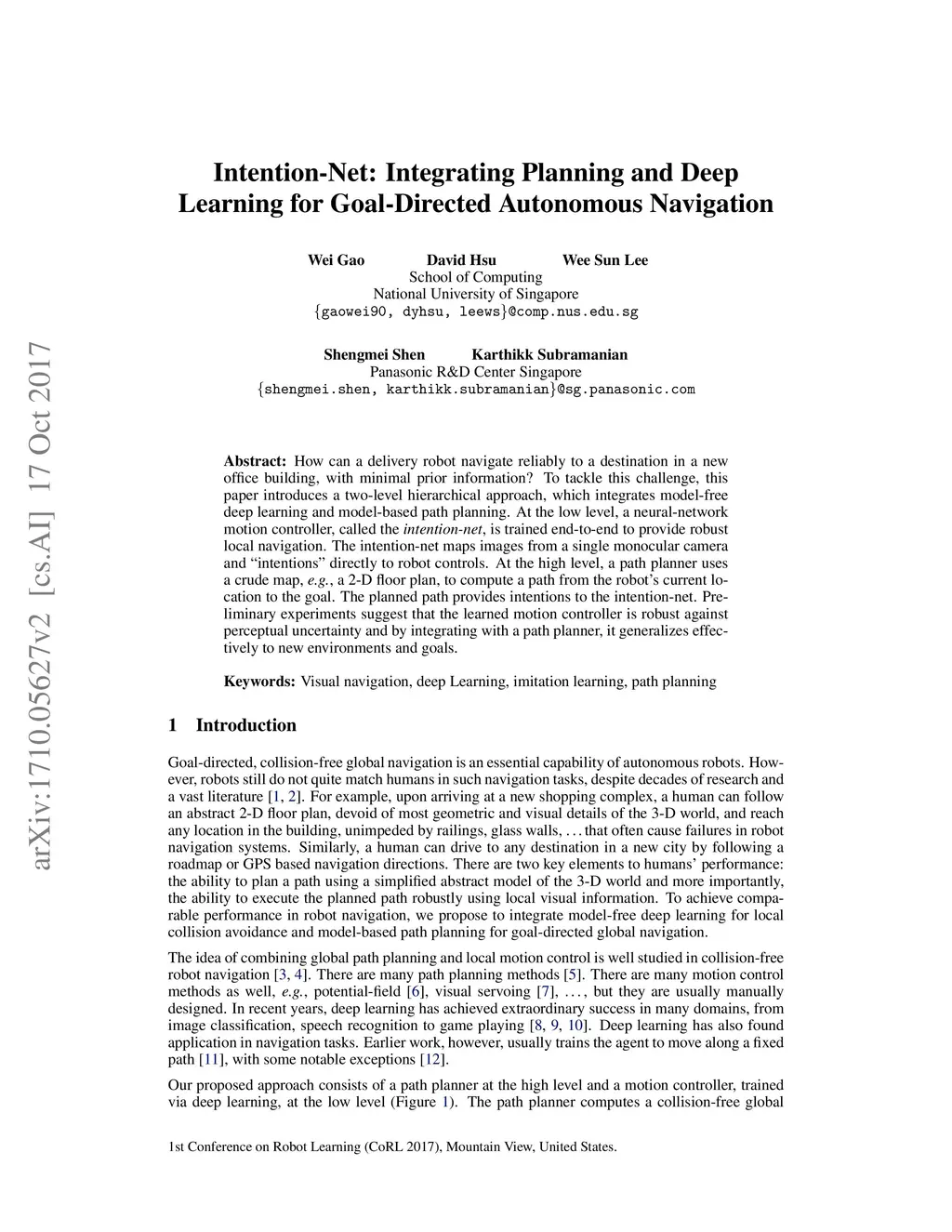 How can a delivery robot navigate reliably to a destination in a new office building, with minimal prior information? To tackle this challenge, this paper introduces a two-level hierarchical approach, which integrates model-free deep learning and model-based path planning. At the low level, a neural-network motion controller, called the intention-net, is trained end-to-end to provide robust local navigation. The intention-net maps images from a single monocular camera and "intentions" directly to robot controls. At the high level, a path planner uses a crude map, e.g., a 2-D floor plan, to compute a path from the robot's current location to the goal. The planned path provides intentions to the intention-net. Preliminary experiments suggest that the learned motion controller is robust against perceptual uncertainty and by integrating with a path planner, it generalizes effectively to new environments and goals.