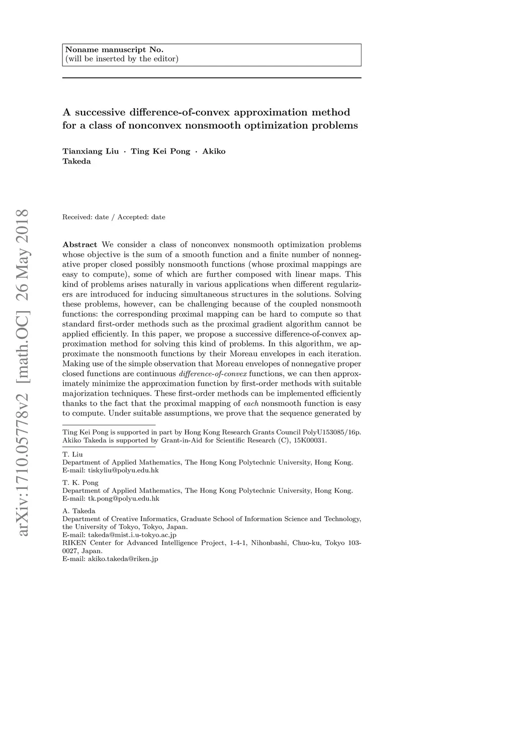 We consider a class of nonconvex nonsmooth optimization problems whose objective is the sum of a smooth function and a finite number of nonnegative proper closed possibly nonsmooth functions (whose proximal mappings are easy to compute), some of which are further composed with linear maps. This kind of problems arises naturally in various applications when different regularizers are introduced for inducing simultaneous structures in the solutions. Solving these problems, however, can be challenging because of the coupled nonsmooth functions: the corresponding proximal mapping can be hard to compute so that standard first-order methods such as the proximal gradient algorithm cannot be applied efficiently. In this paper, we propose a successive difference-of-convex approximation method for solving this kind of problems. In this algorithm, we approximate the nonsmooth functions by their Moreau envelopes in each iteration. Making use of the simple observation that Moreau envelopes of nonnegative proper closed functions are continuous {\em difference-of-convex} functions, we can then approximately minimize the approximation function by first-order methods with suitable majorization techniques. These first-order methods can be implemented efficiently thanks to the fact that the proximal mapping of {\em each} nonsmooth function is easy to compute. Under suitable assumptions, we prove that the sequence generated by our method is bounded and any accumulation point is a stationary point of the objective. We also discuss how our method can be applied to concrete applications such as nonconvex fused regularized optimization problems and simultaneously structured matrix optimization problems, and illustrate the performance numerically for these two specific applications.