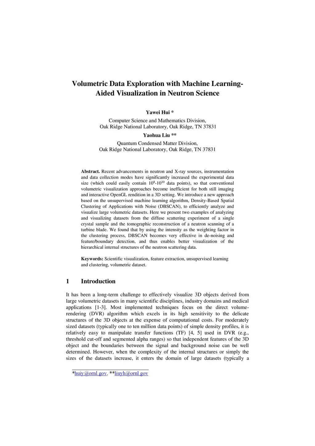 Recent advancements in neutron and X-ray sources, instrumentation and data collection modes have significantly increased the experimental data size (which could easily contain 10 -- 10 data points), so that conventional volumetric visualization approaches become inefficient for both still imaging and interactive OpenGL rendition in a 3D setting. We introduce a new approach based on the unsupervised machine learning algorithm, Density-Based Spatial Clustering of Applications with Noise (DBSCAN), to efficiently analyze and visualize large volumetric datasets. Here we present two examples of analyzing and visualizing datasets from the diffuse scattering experiment of a single crystal sample and the tomographic reconstruction of a neutron scanning of a turbine blade. We found that by using the intensity as the weighting factor in the clustering process, DBSCAN becomes very effective in de-noising and feature/boundary detection, and thus enables better visualization of the hierarchical internal structures of the neutron scattering data.